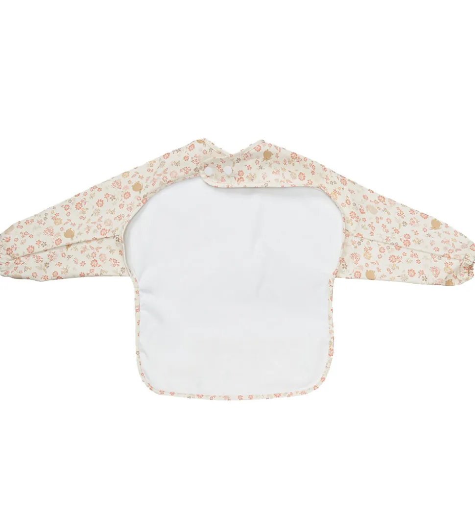 Fint Cam Cam Copenhagen forklæde i hvid med et alloverprint af blomster og kaniner i rosa og brune nuancer.
