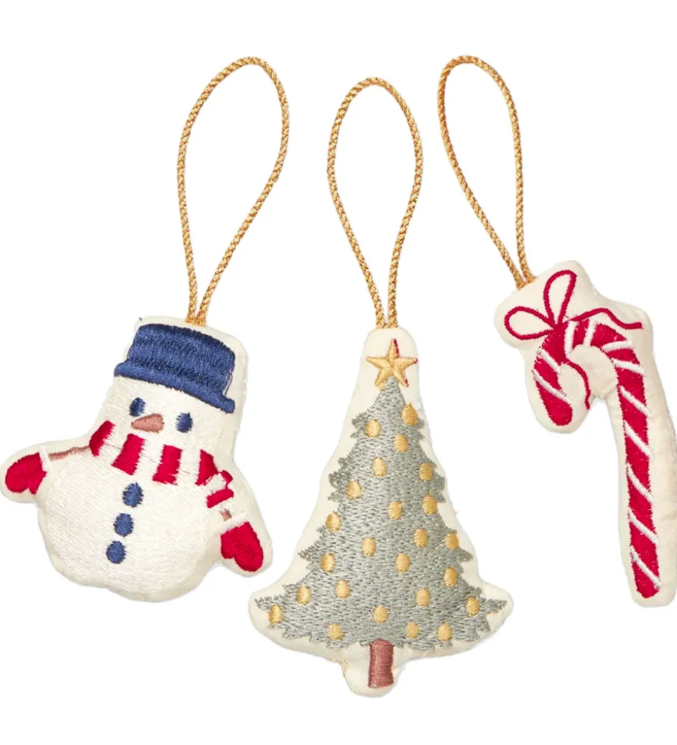 Smukt Cam Cam Copenhagen julepynt-sæt, som består af en snemand, en et juletræ og en julestok, der alle er flot broderede.