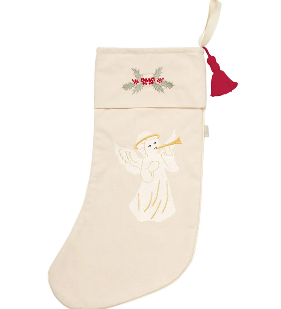 Smuk Cam Cam Copenhagen julesok i naturfarve med farverige broderier af en engel, en julestok og kristtorn.