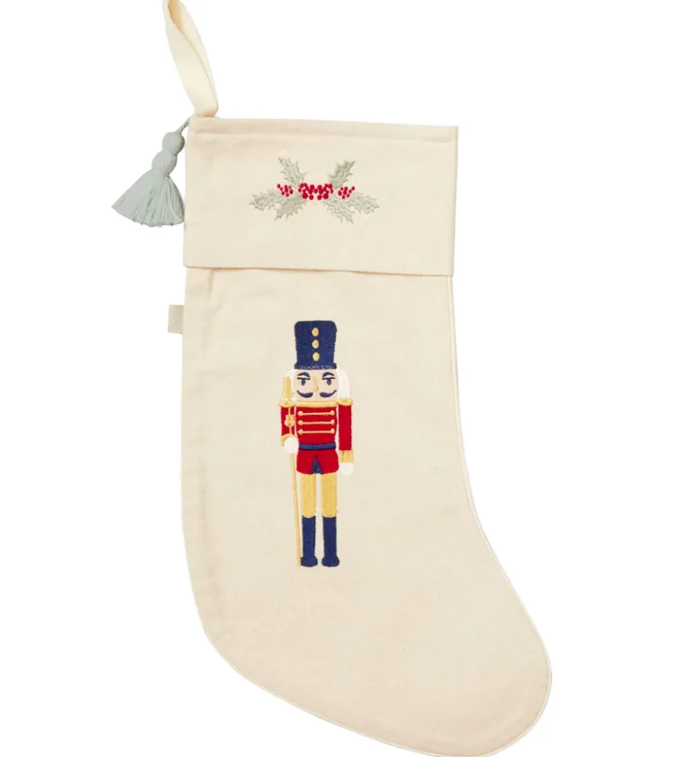 Smuk Cam Cam Copenhagen julesok i naturfarve med farverige broderier af en nøddeknækker, et juletræ og kristtorn.