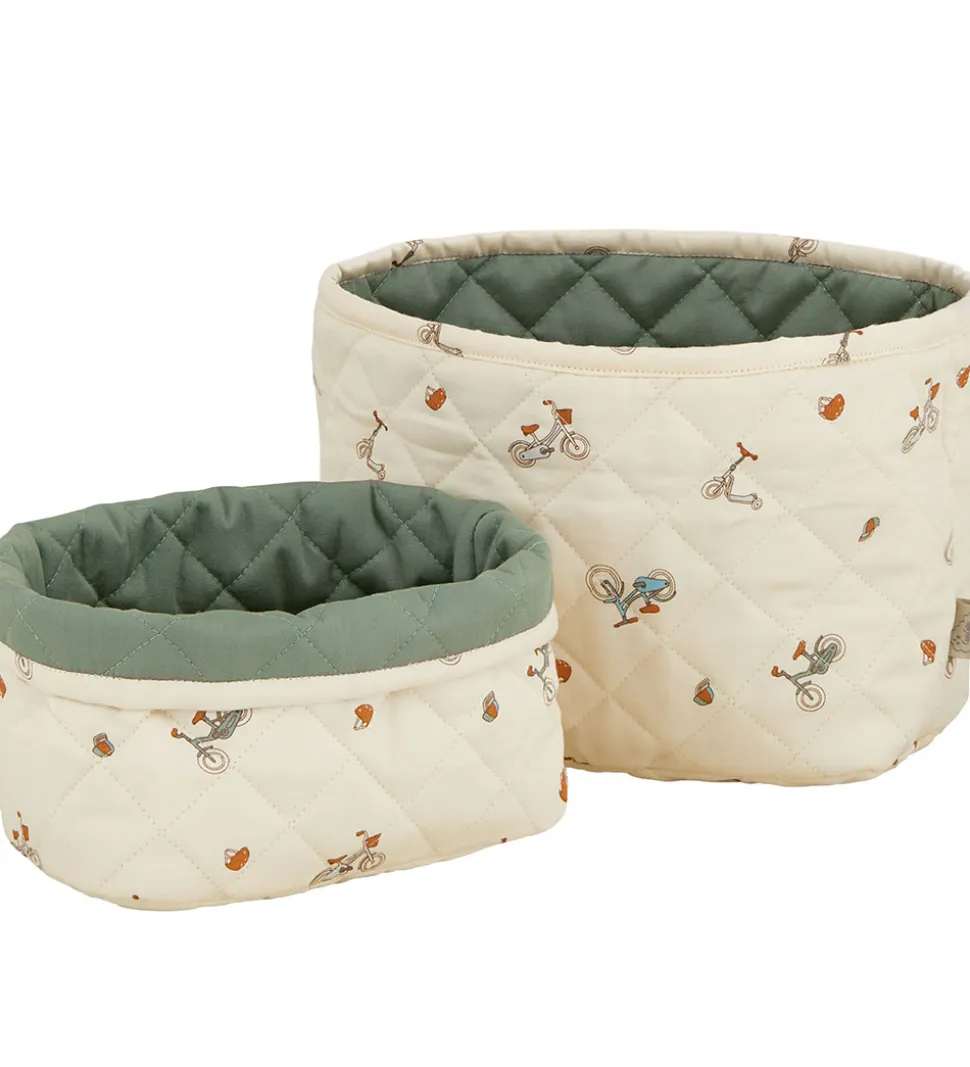 Skønne Cam Cam Copenhagen opbevaringskurve, der på den ene side er beige med et alloverprint af fine, små cykler i blå, grønne og brune nuancer, og på den anden side er i ensartet støvet grøn. Opbevaringskurvene er med en quiltet struktur, og kanten kan foldes ned for at give et flot look.