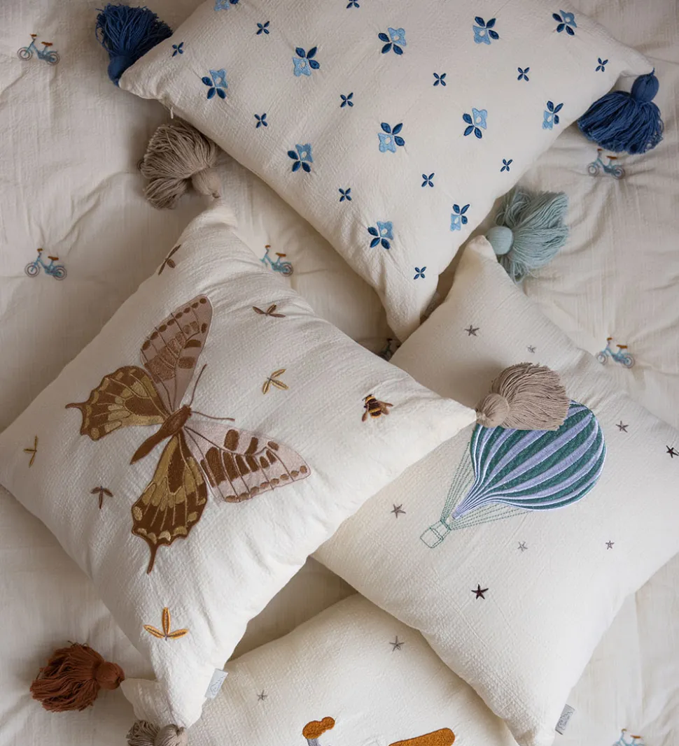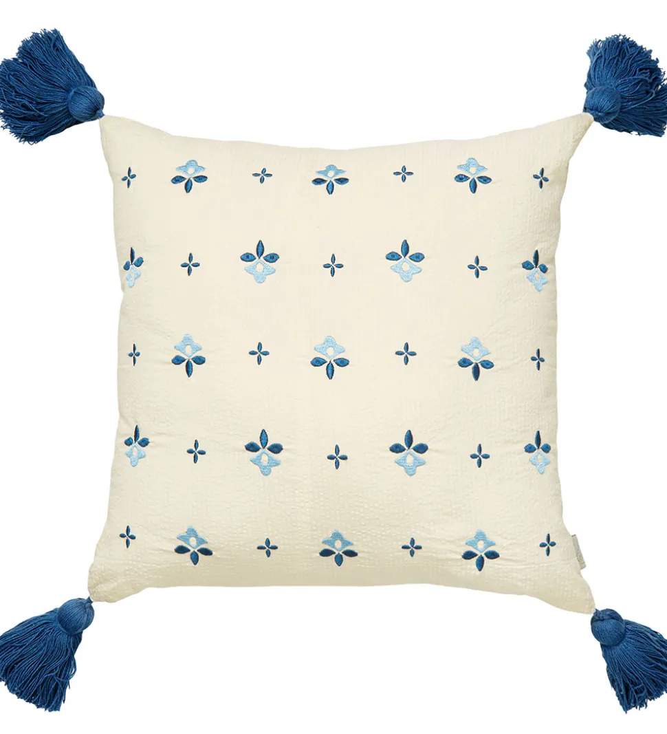 Flot Cam Cam Copenhagen pude i cremehvid med en fin struktur i stoffet og blåbroderede, små blomster fortil. I alle hjørner er der søde kvaster.