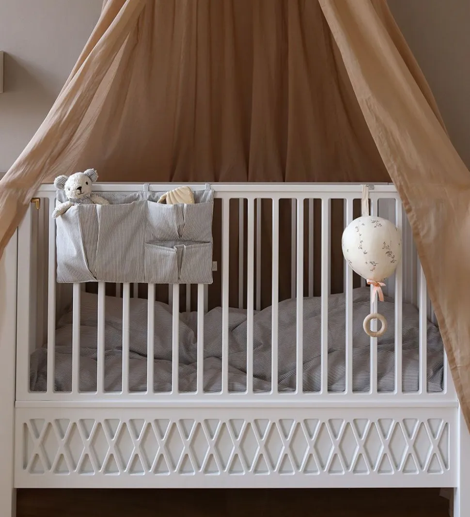 Cam Cam Copenhagen sengelommen har tre lommer, som kan bruges til bl.a. sutter, flasker eller nusseklude, så de altid er lige ved hånden. Sengelommen sættes fast på tremmesengen eller kravlegårdens tremmer med velcrostropper.