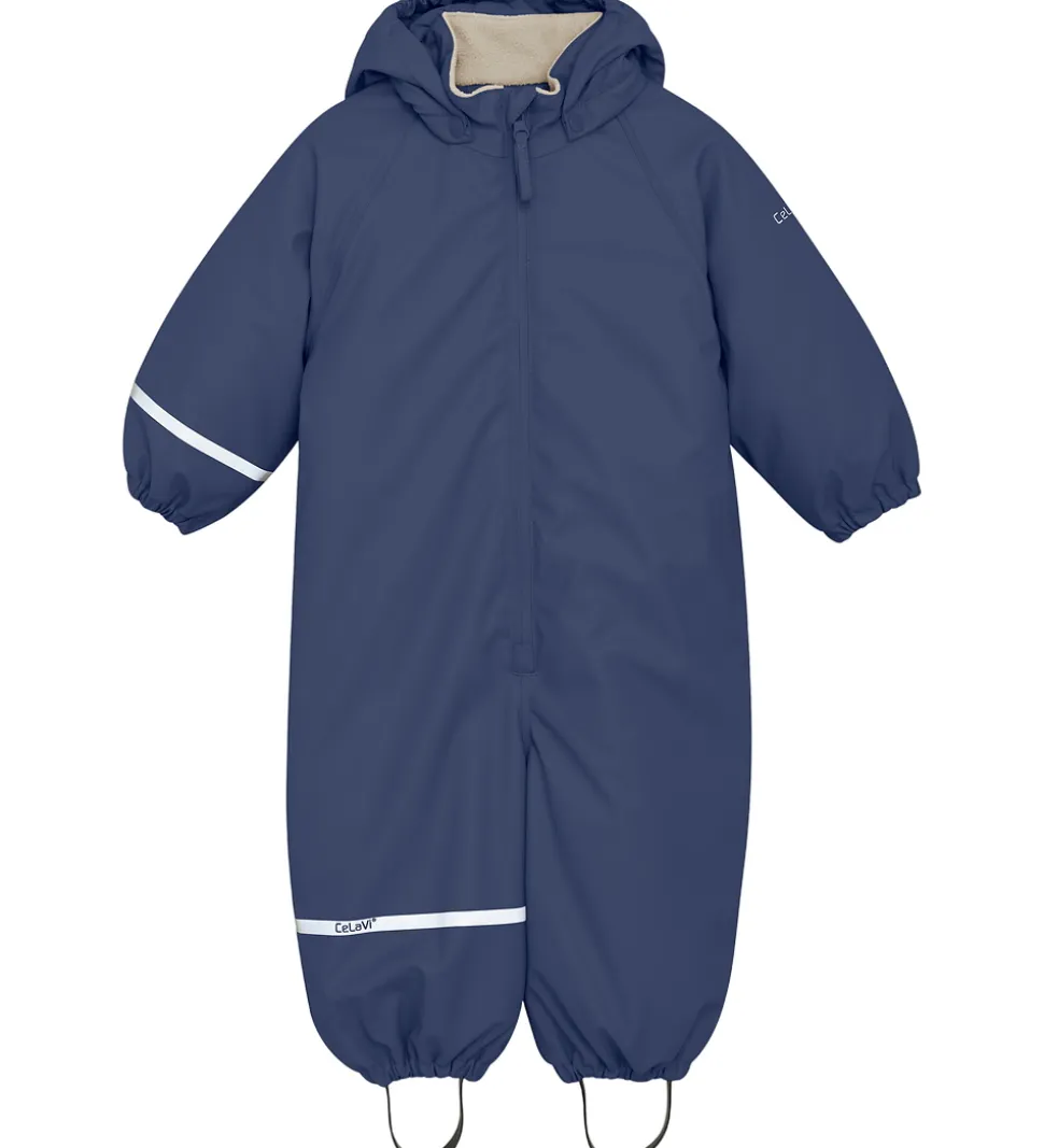 CeLaVi regndragten har en høj, fleeceforet hals med en aftagelig hætte, som kan knappes af med trykknapper. I kanten af hætten, ærmerne og benene er der elastikkanter. I benåbningerne er der justerbare elastikstropper, som kan sættes rundt om fodtøjet.