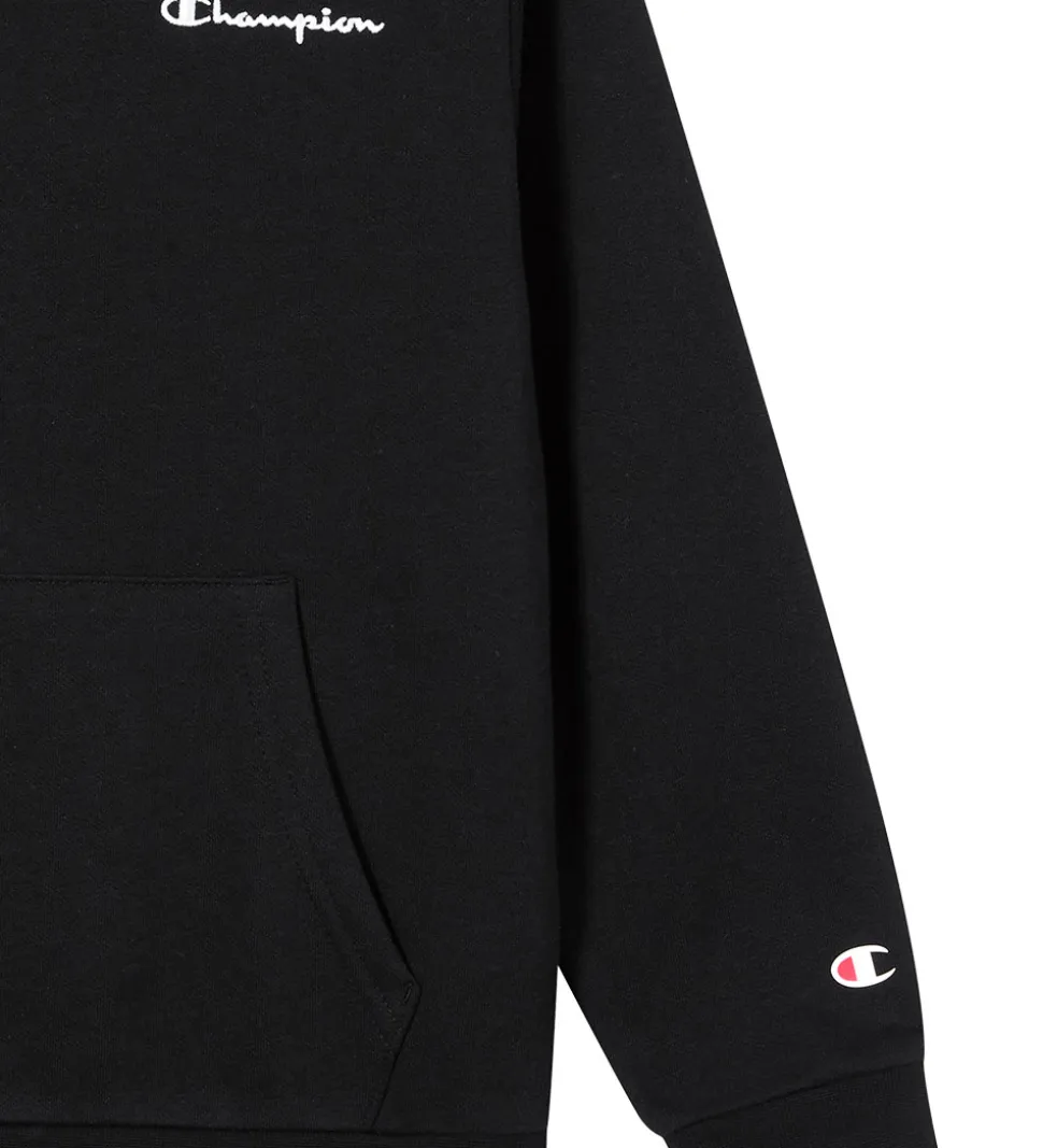 Stilfuld Champion hættetrøje i klassisk sort med et diskret, broderet Champion logo på brystet i hvid. Hættetrøjen har en rummelig kængurulomme foran. Ved ærmets afslutning ses et lille Champion emblem. Ribkanter ved håndleddene giver hættetrøjen et enkelt udtryk. På indersiden har hættetrøjen blødt, børstet bomuld.