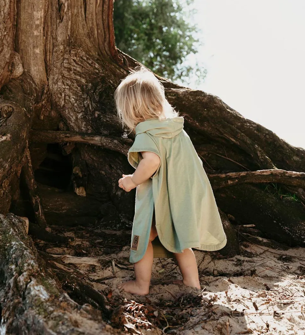 Lækker Cloby UV poncho i ensfarvet olivengrøn med en brun logo-applikation.