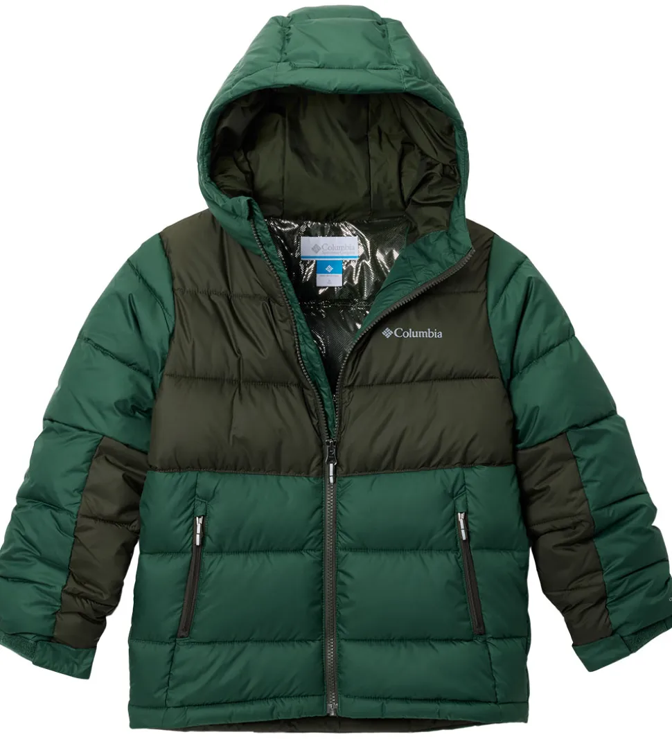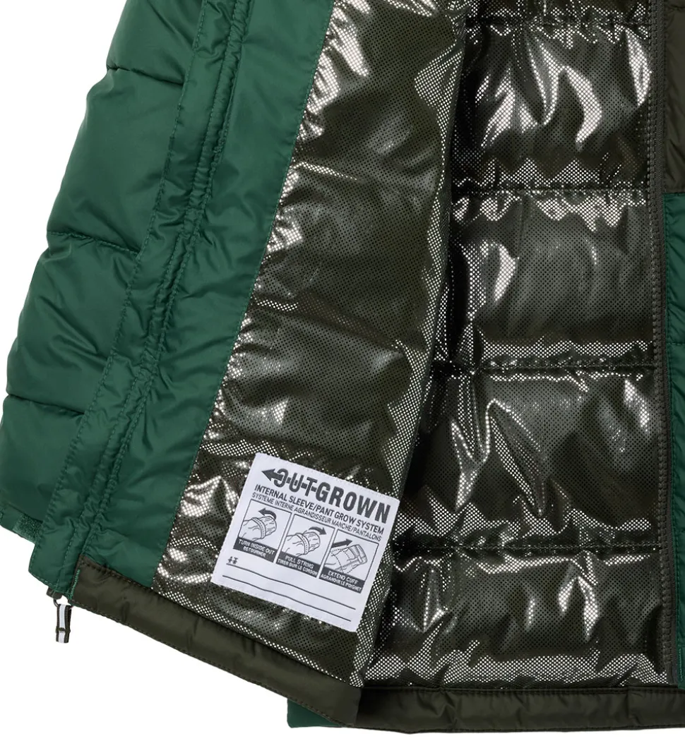 Columbia dynejakken åbnes ved hjælp af en lynlås med indvendig vindstolpe og hagebeskytter. Dynejakken har fortil forede lynlåslommer. I venstre side er der en stor inderlomme, som lukkes med velcro.