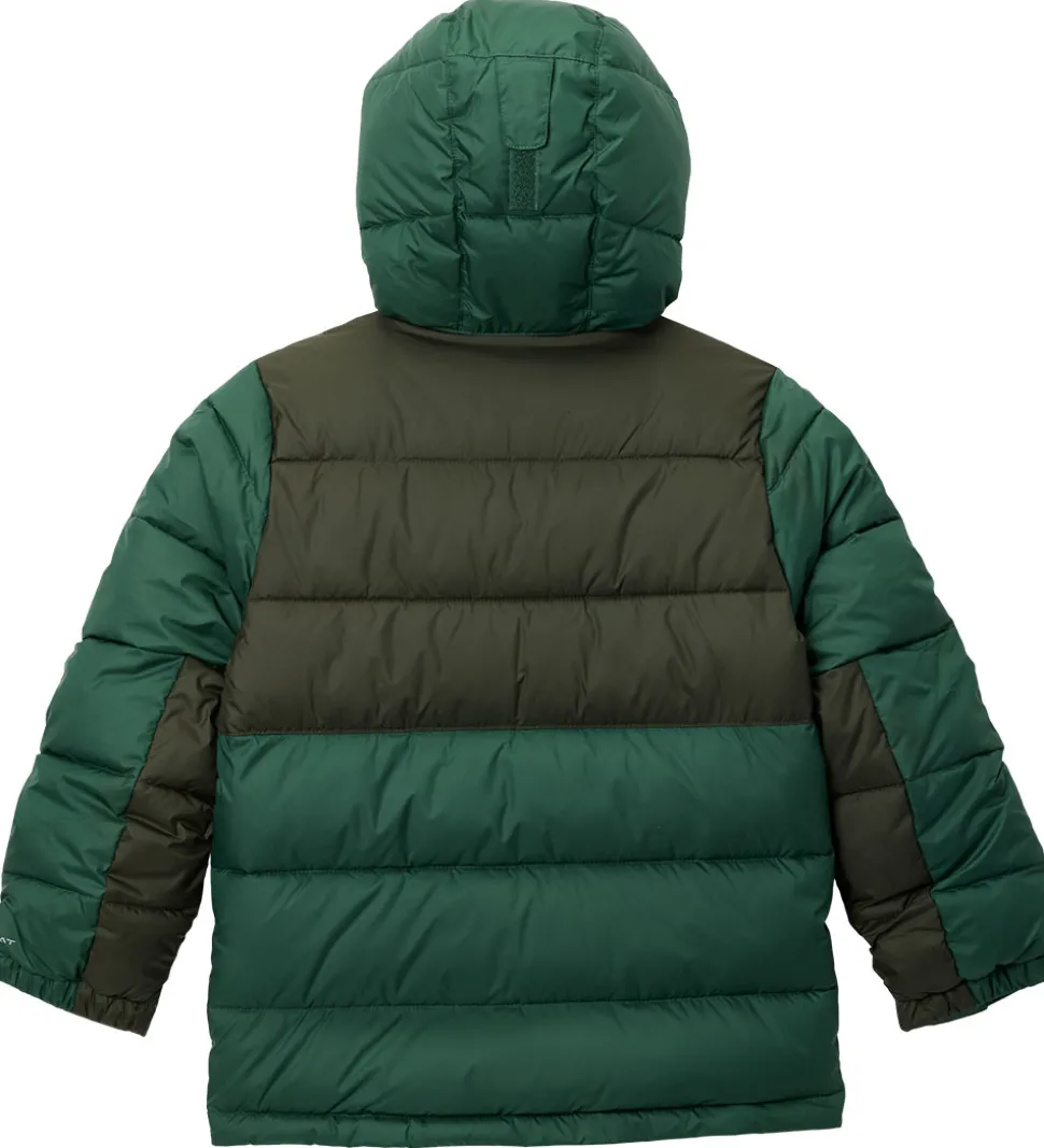 Columbia dynejakken har en fast hætte, der kan justeres i toppen med velcro. Dynejakkens armåbninger har elastiske kanter, som desuden også kan strammes ind med en velcrostrop.