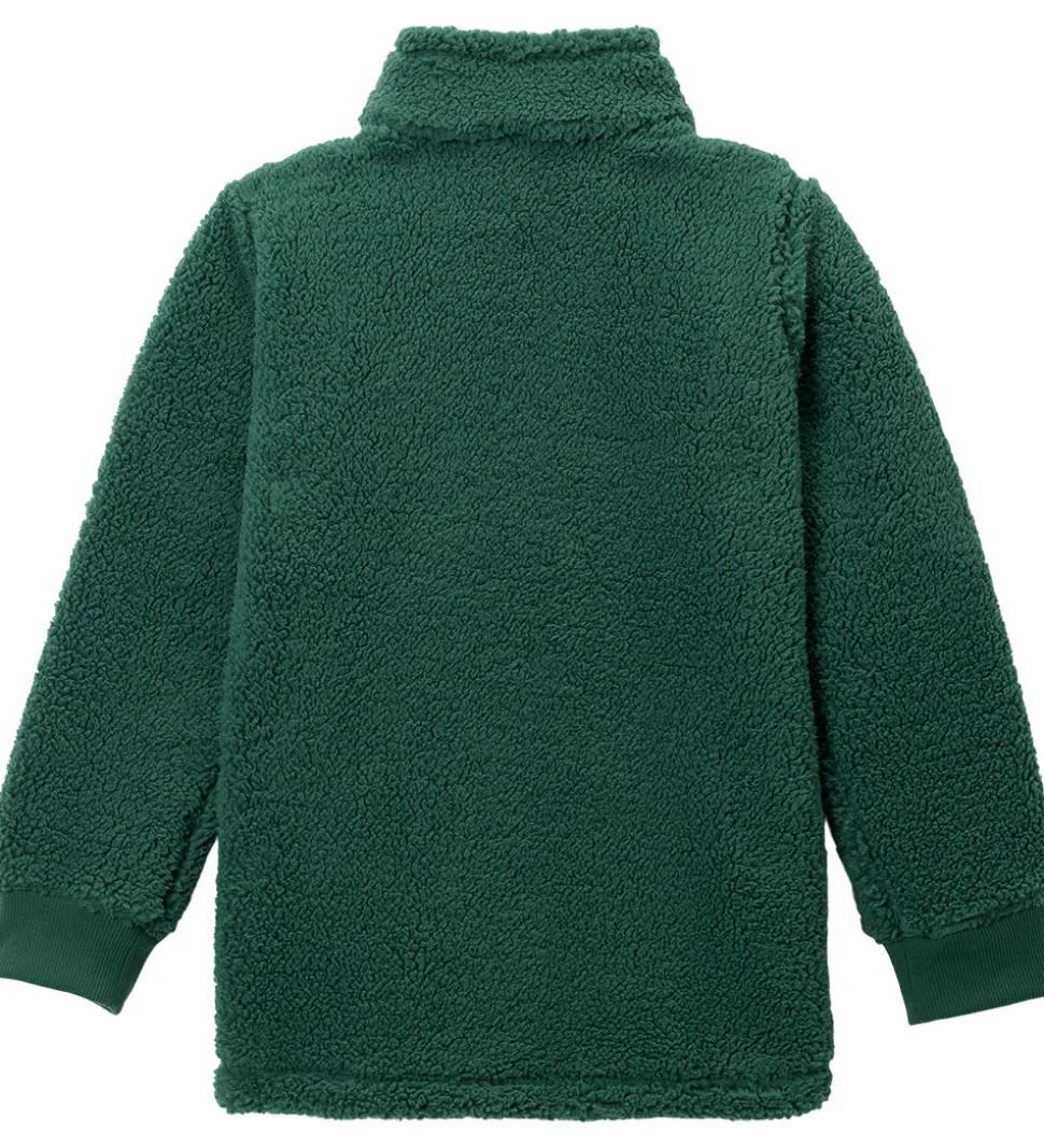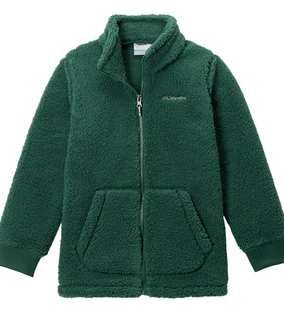 Hyggelig Columbia fleecejakke i grøn teddyfleece med et broderet logo i grå på venstre bryst.
