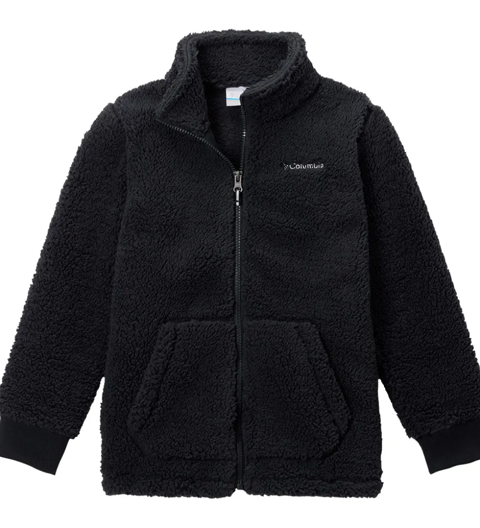 Hyggelig Columbia fleecejakke i sort teddyfleece med et broderet logo i grå på venstre bryst.