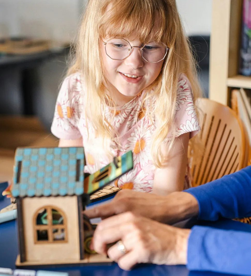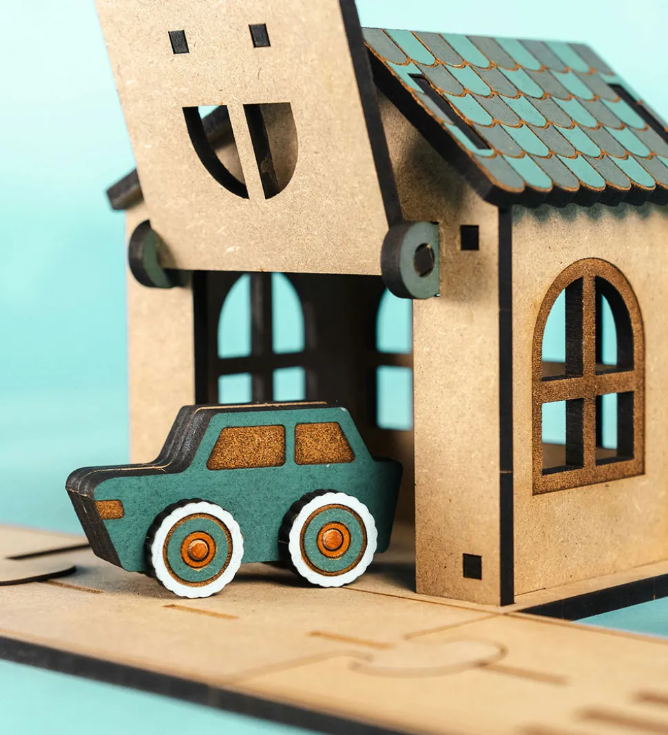 Med Crateit sættet kan du bygge din egen garage. Træet i sættet kommer ufarvet og man skal derfor selv farvelægge det. Det kan farves med alle typer af tusser, maling eller farveblyanter.