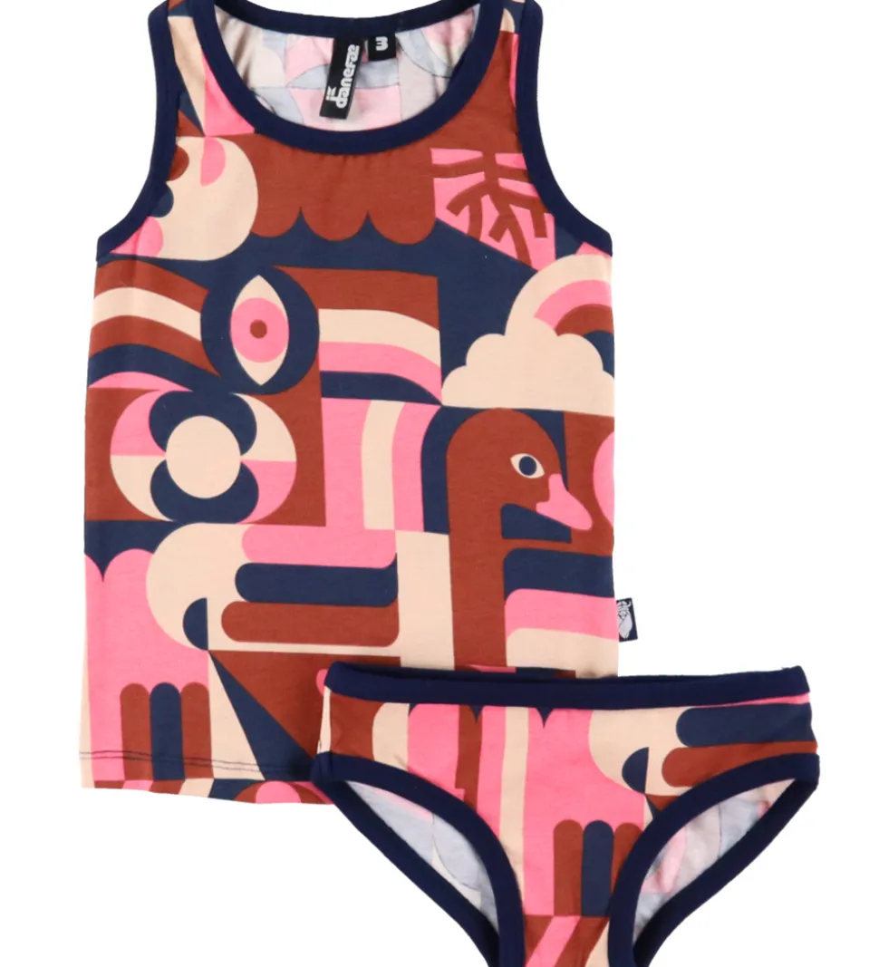 Fint Danefæ nattøj bestående af en undertrøje og et par trusser med farverigt mønster i primært rosa og navyblå. Undertrøjen har brede skulderstropper og en rund halsudskæring. Trusserne har en elastisk talje.