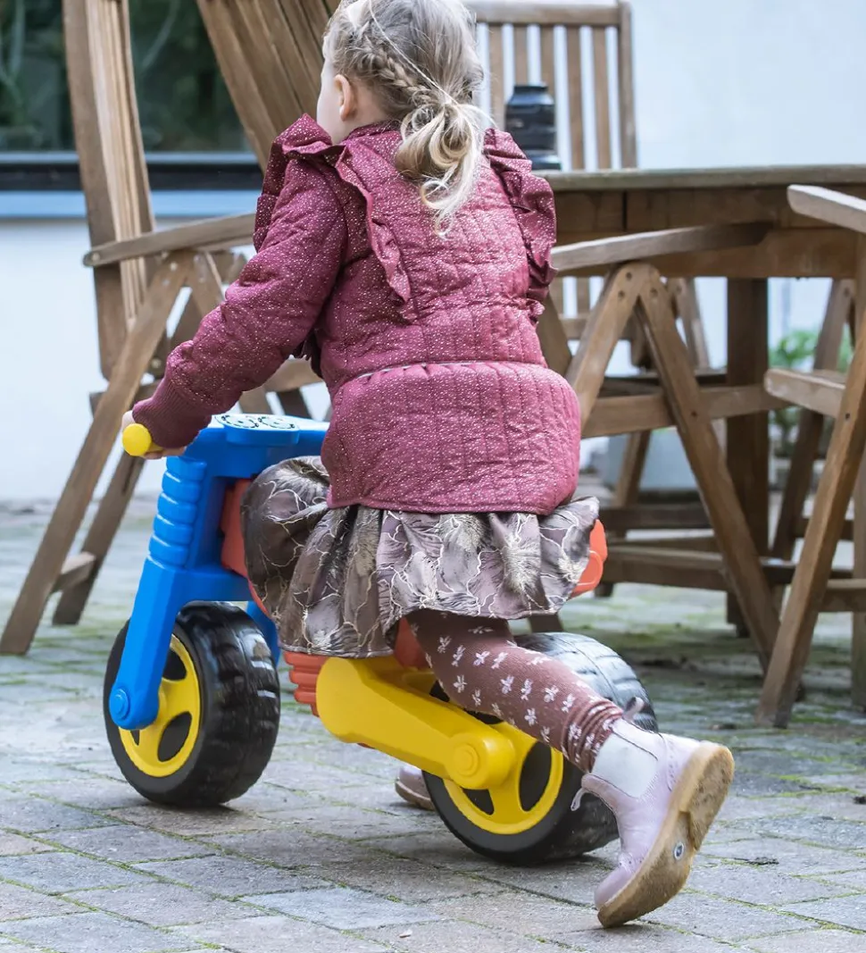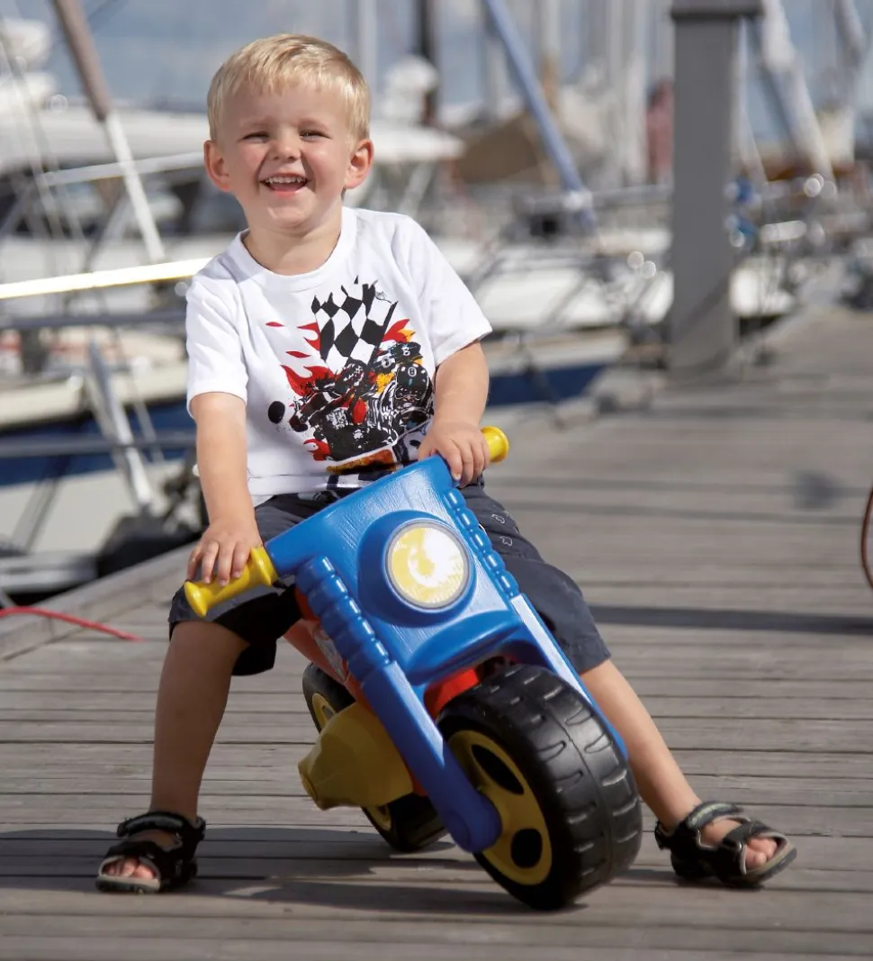 Dantoy DT1 Raceren har to brede plastik hjul og en forlygte på fronten. På siderne er der klistermærker med “DT1 Racer” skrevet på.