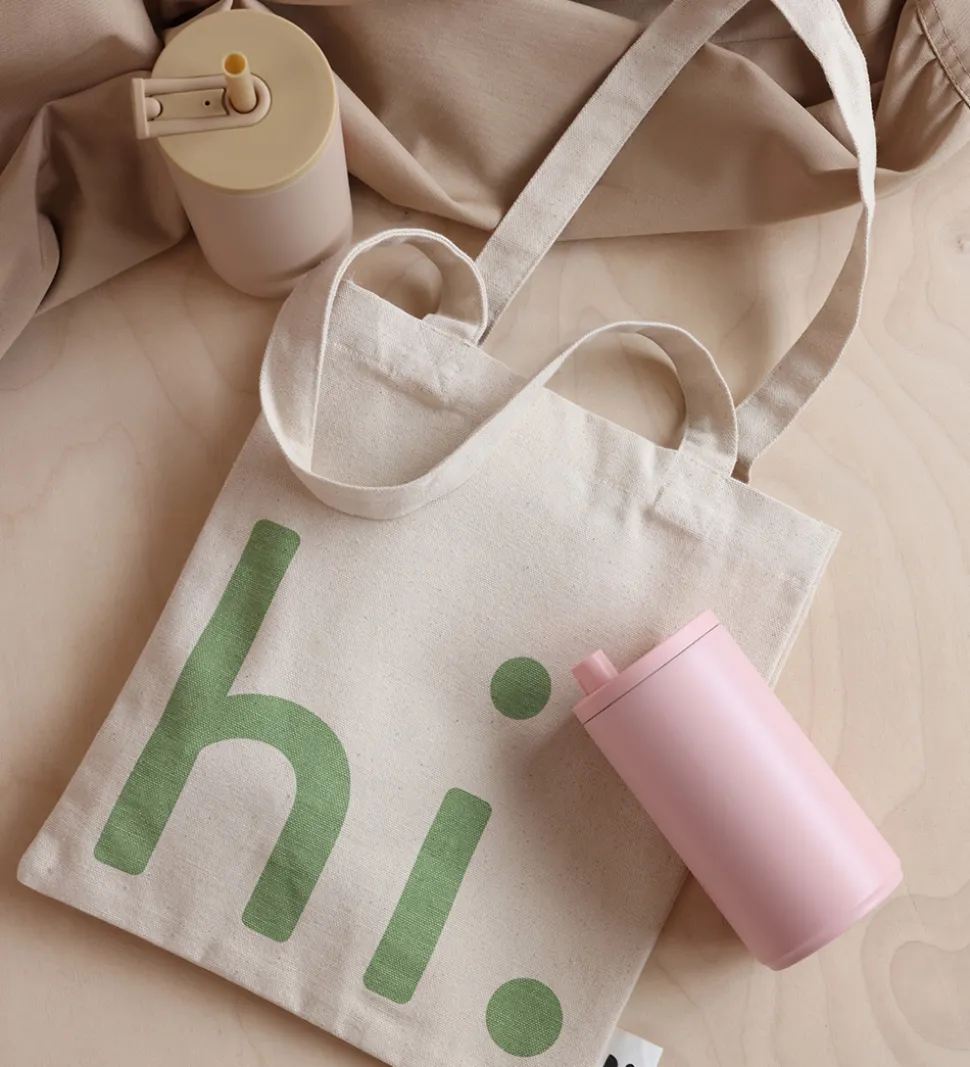Smart Design Letters shopper i naturfarvet bomuld, og på den ene side står der “Hi.” trykt i grøn.