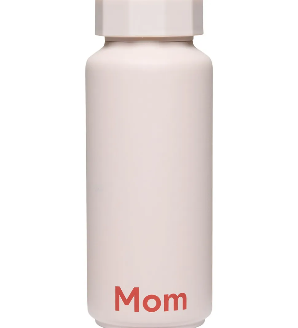 Fin Design Letters termoflaske i lys pudderrosa, og nederst står der “Mom” med røde bogstaver.