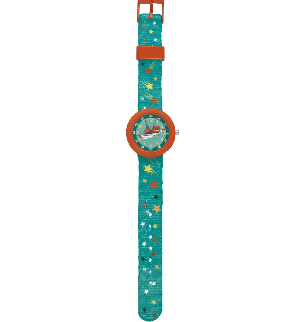 Sødt Djeco armbåndsur i lyseblå med print af stjerner i forskellige farver. På urskiven er der en superhelt, mens rammen er i en rød farve.