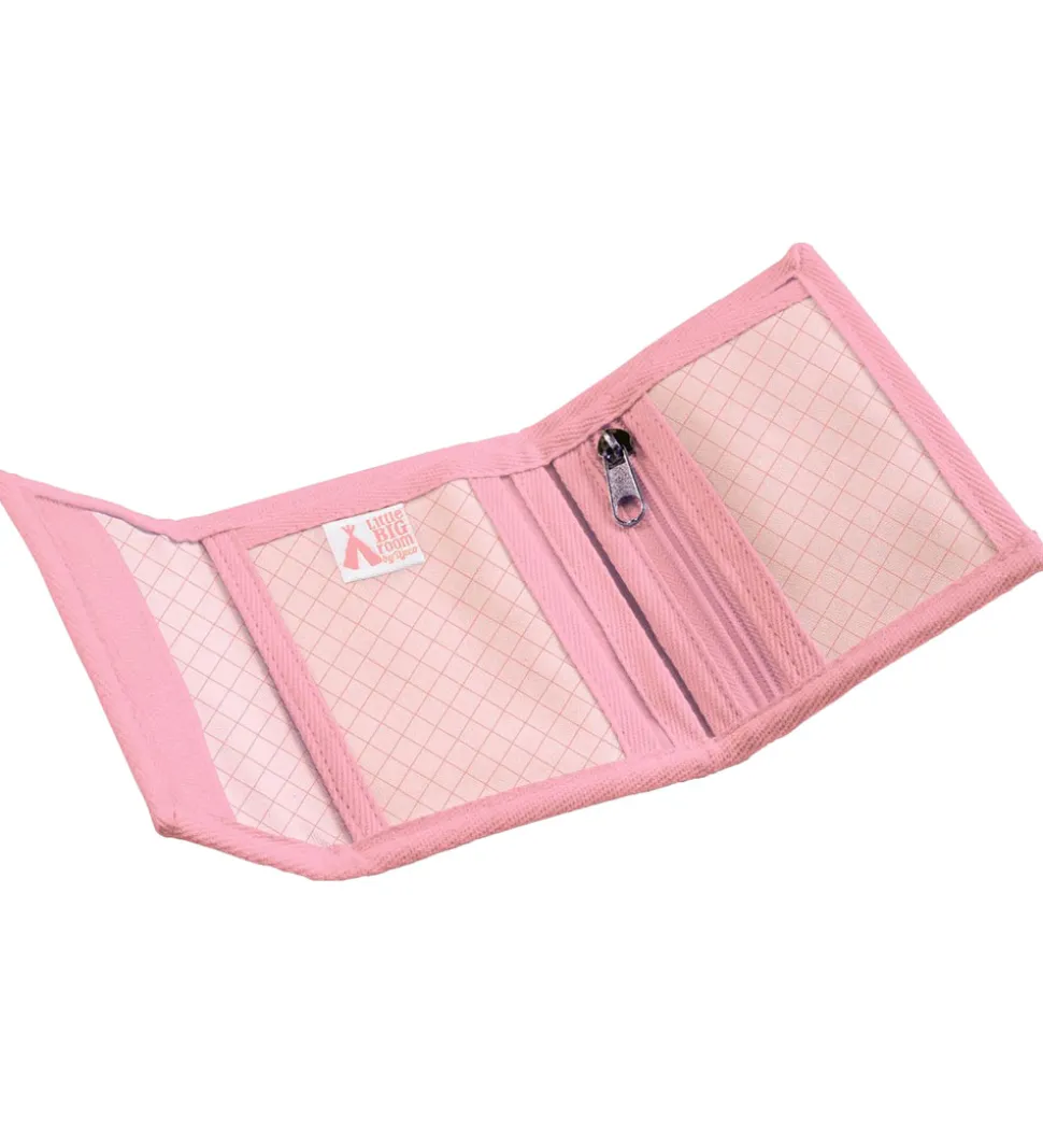 Fin Djeco pung i rosa med et orange, ternet mønster, og på den ene side er trykt en farverige regnbue.