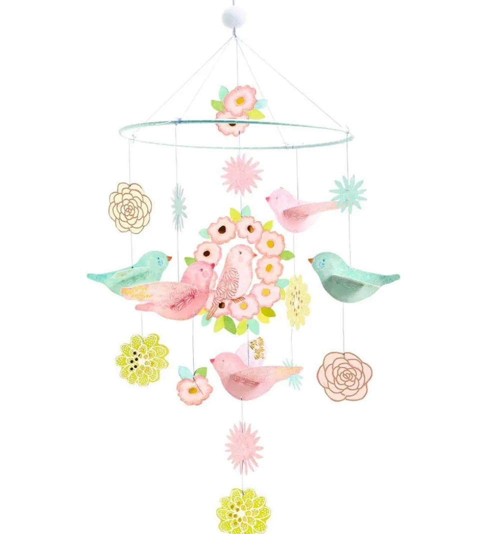 Fin Djeco uro med flotte, farverige vedhæng i et fugletema med fulge og blomster i rosa og grønne farver.