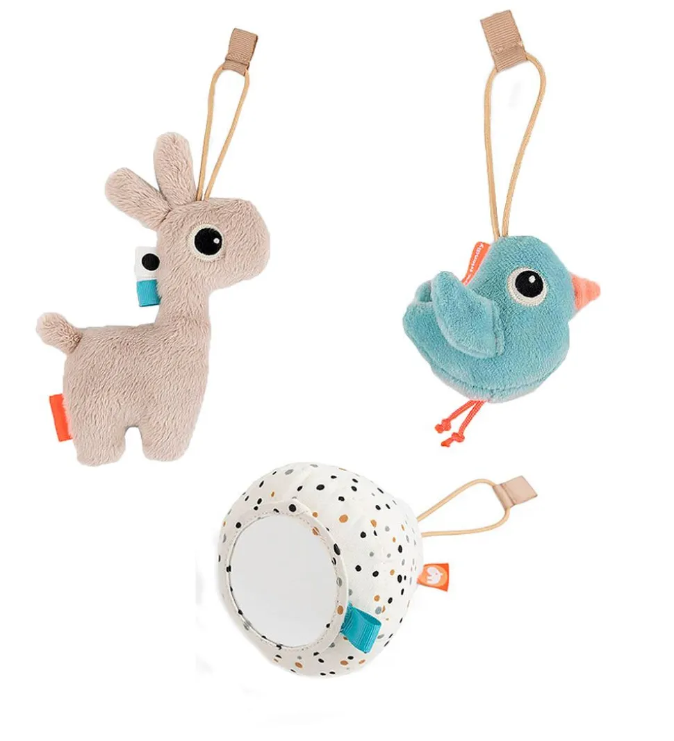 Der medfølger 5 aktiviteter, rangler, spejle, knitrende lyde, former og tekstiler. Disse elementer bidrager til at barnet bliver stimuleret, og deres knitren og raslen medvirker til at barnet kan forblive underholdt i flere timer.