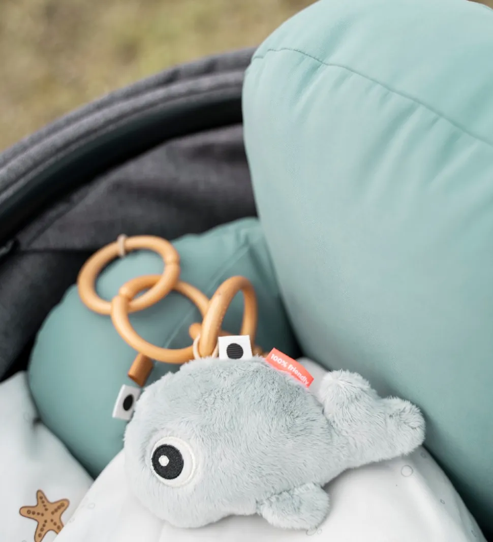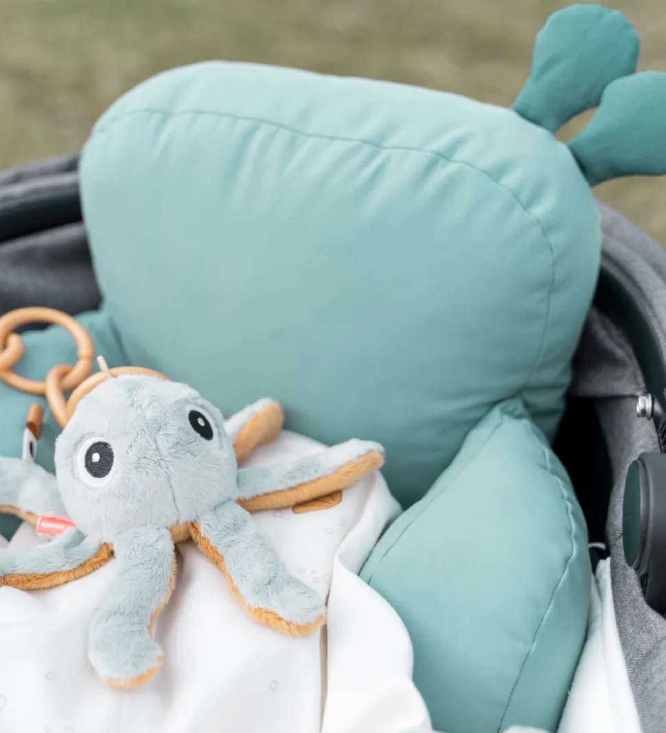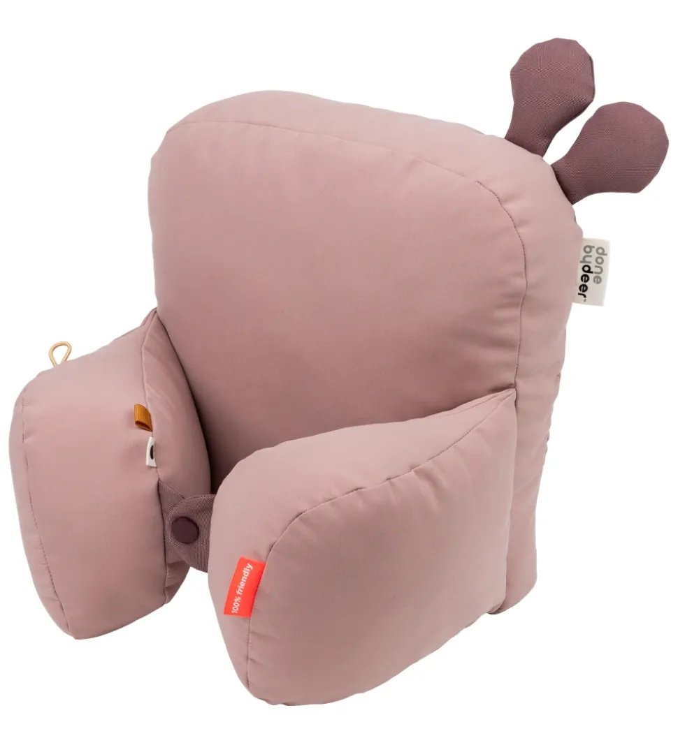 Done By Deer puden giver barnet stabilitet og støtte, når barnet sidder i barnevognen. På puderne i siden er der små flapper som barnet kan lege med, og de to sidepuder kan knappes sammen med trykknapper. Puden er vatteret og fremstillet i en blød kvalitet.
