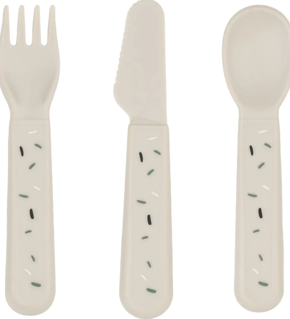 Flot Done by Deer børnebestik bestående af en gaffel, kniv og ske i beige med konfetti i sorte, hvide og grønne nuancer på håndtaget.