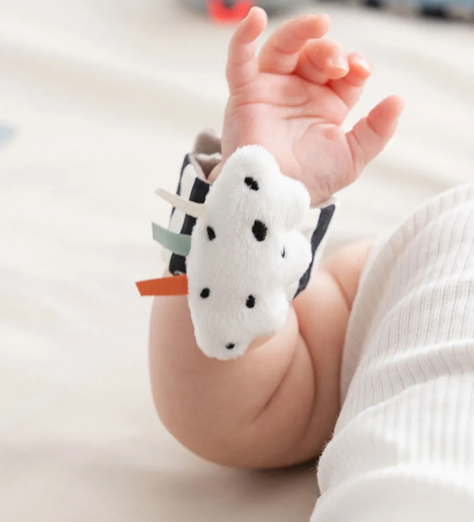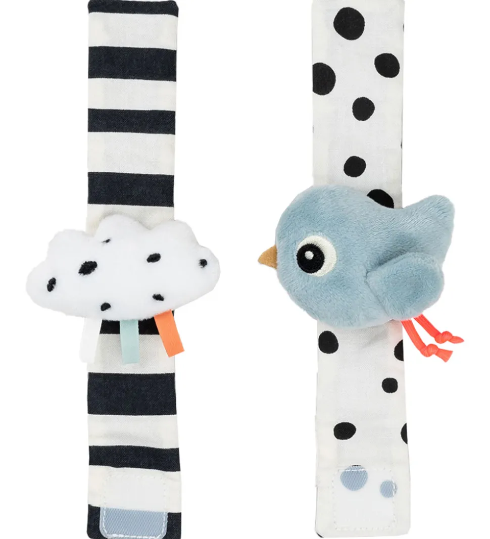 Spændende Done by Deer håndledsranglesæt solgt i en 2-pak, hvoraf den ene er med sorte og hvide stribe og en sky-rangle, mens den anden er hvid med sorte prikker og en blå Birdee-rangle.