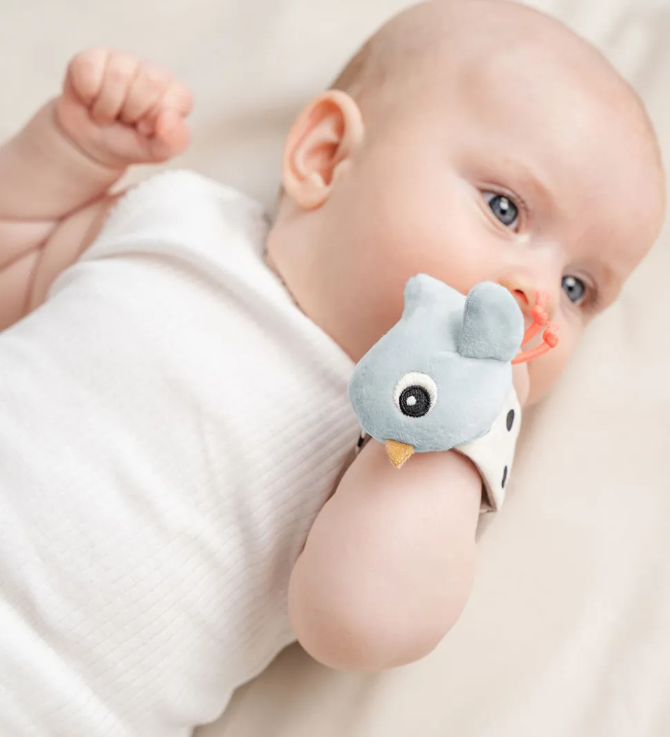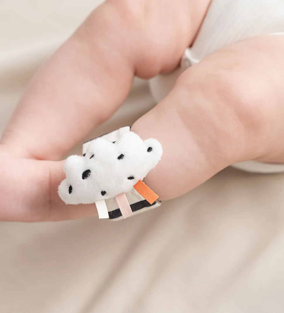 Done by Deer håndledsranglerne sættes omkring håndleddet og holdes på plads med velcro. Ranglerne rasler, når barnet leger og undersøger dem på håndleddet.