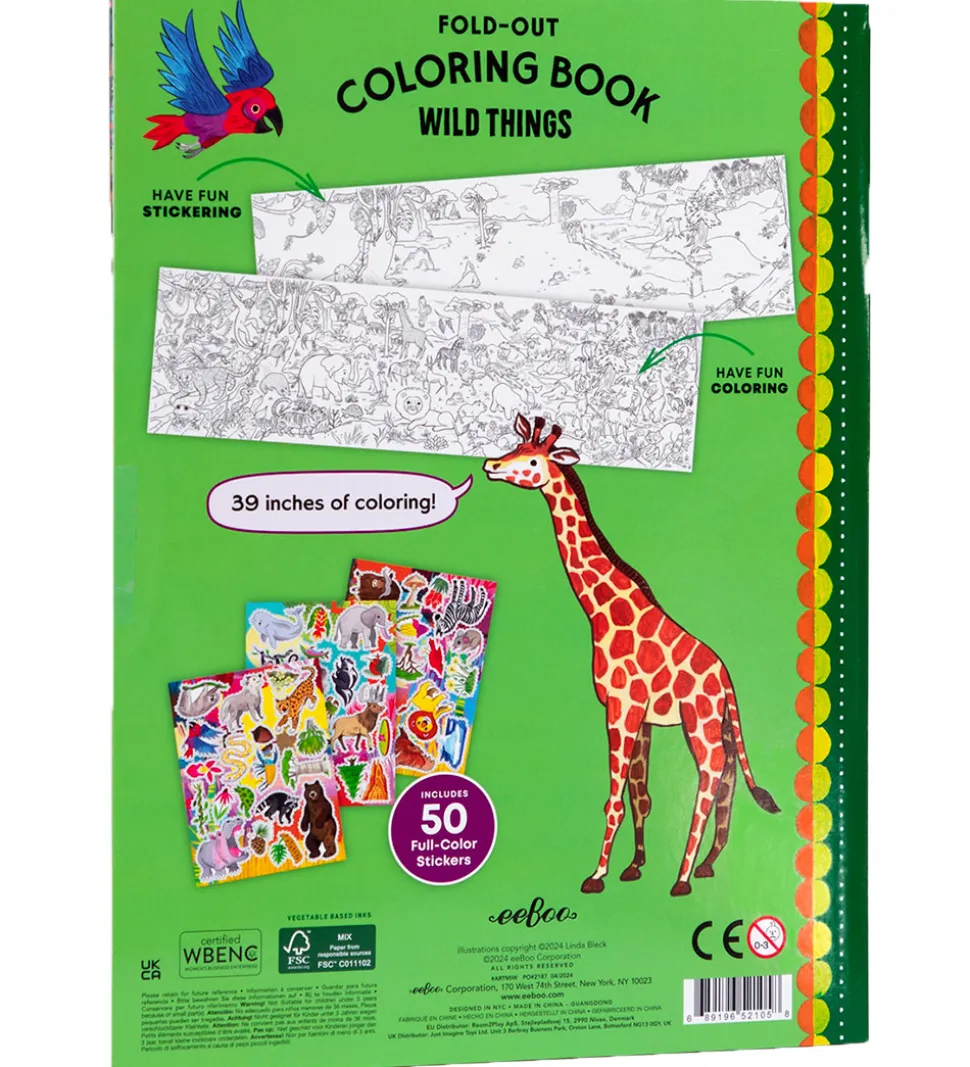 Fin Eeboo fold ud malebog med motiver af vilde dyr. Der medfølger 50 klistermærker, som der også kan dekoreres med.