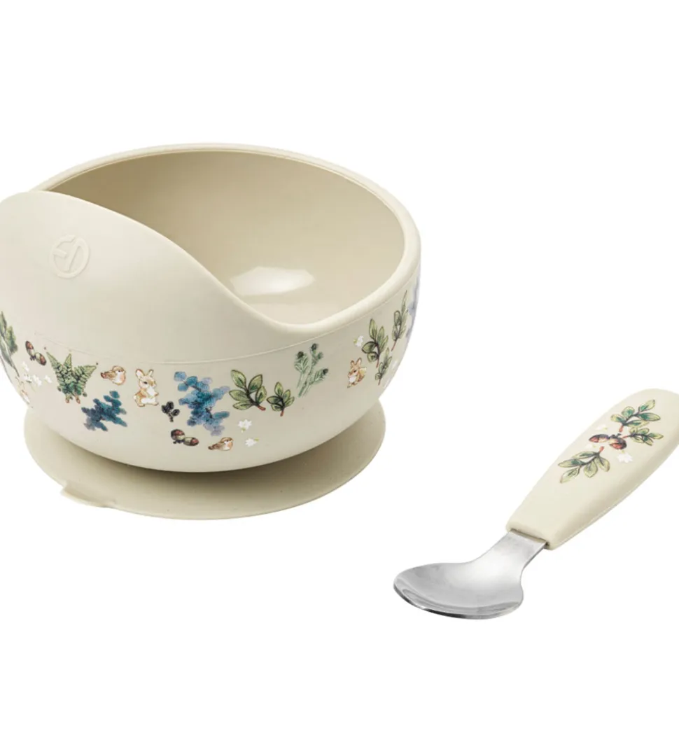 Praktisk Elodie Details skål og ske i beige med et fint print af naturmotiver i forskellige farver. Skålen er fremstillet af silikone og skeen er fremstillet af silikone og rustfrit stål, som er slidstærkt og tåler at blive tabt. Skålen har en sugekop under bunden, så den ikke sidder godt fast på bordet under måltidet.