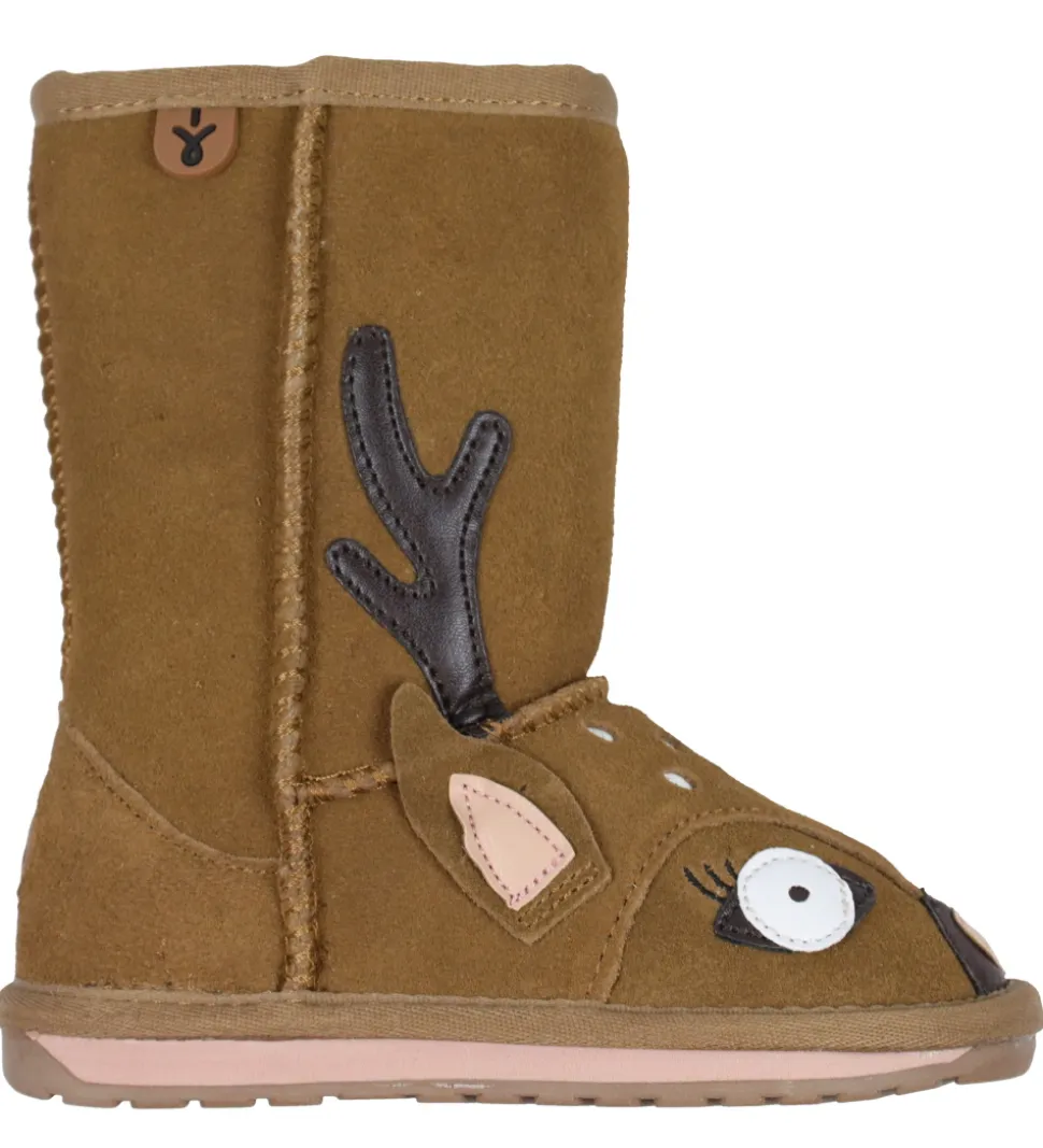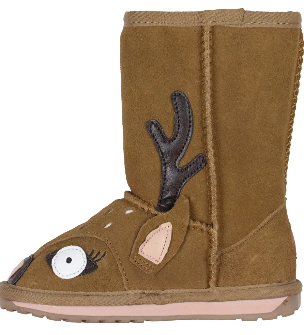 Fine EMU Australia bamsestøvler i brunt ruskind, og på foden er den dekoreret som en sød hjort.