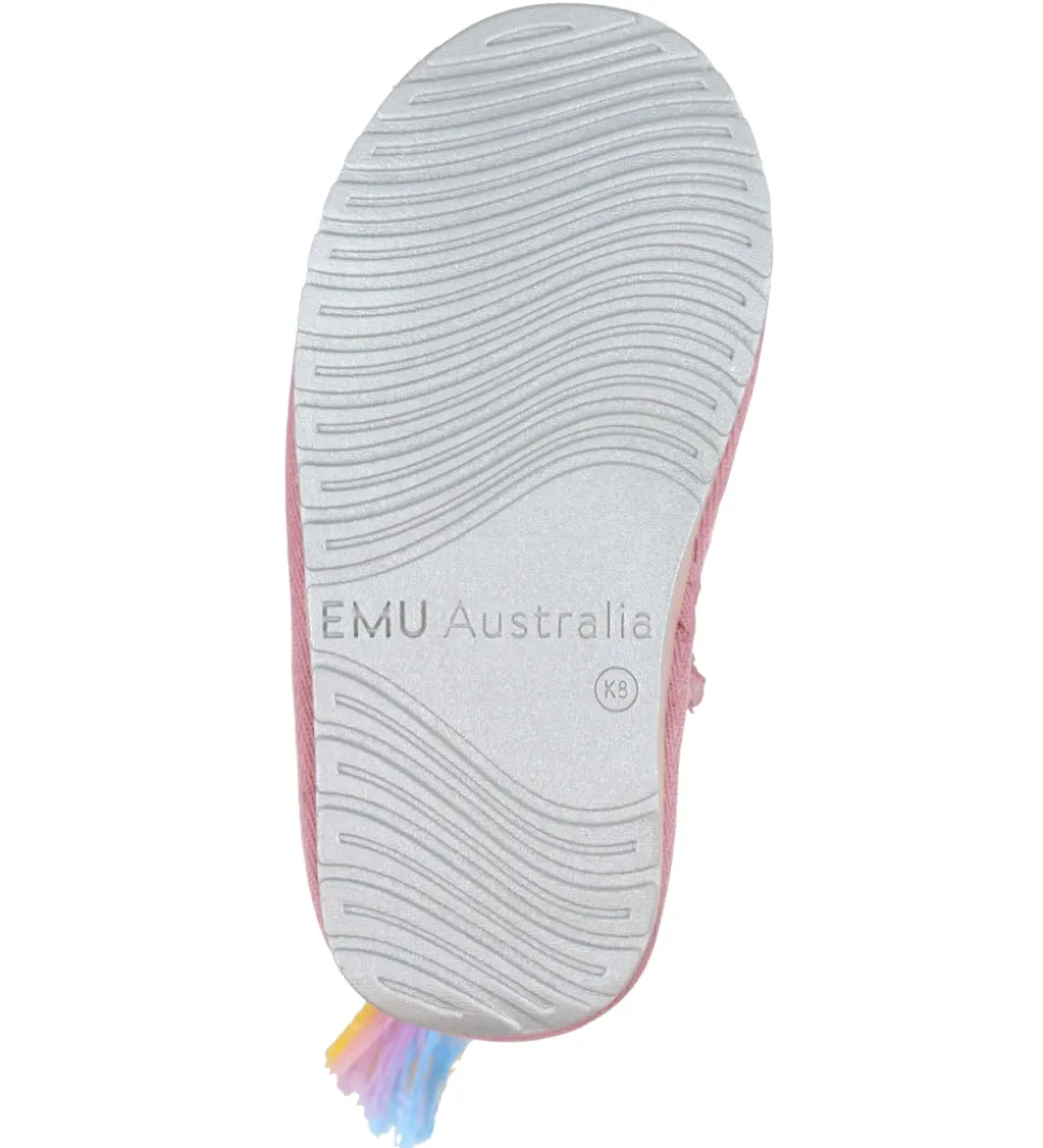 Søde EMU Australia bamsestøvler i rosa ruskind, og på foden og op ad skaftet er de dekorede som en enhjørning.