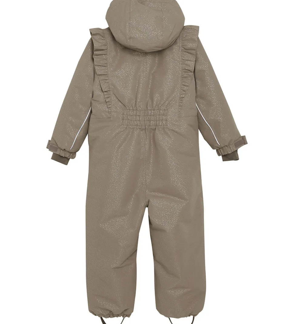 Pæn En Fant flyverdragt i beige med et allovermønster af skinnende guldprikker. Flyverdragten er med refleksprint og -pipings og har flotte flæser over skuldrene.
