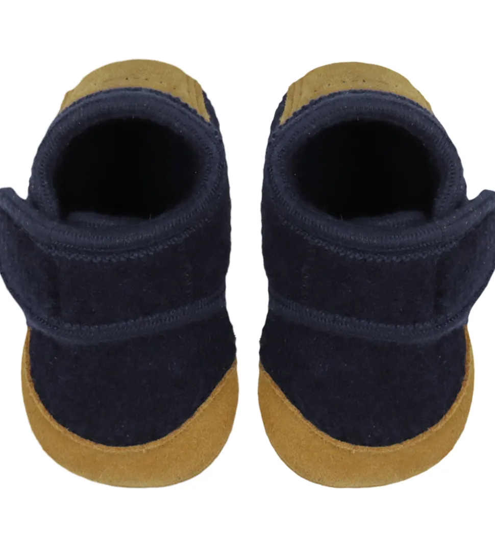 Smarte En Fant hjemmesko i mørkeblåt uld med lysebrunt ruskind på snuden og hælen.