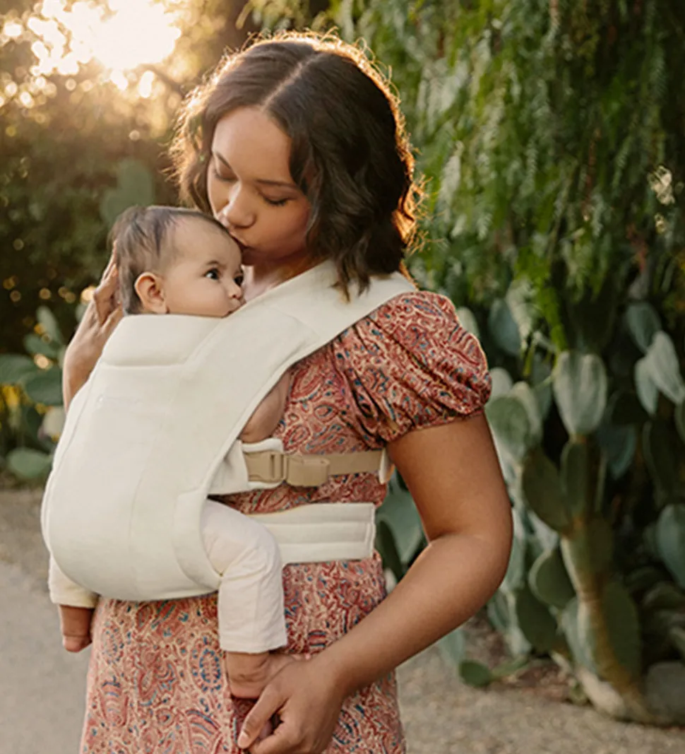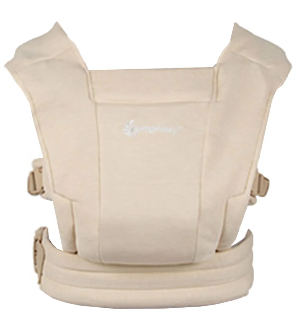 Skøn Ergobaby bæresele i cremefarvet med et hvidt, broderet logo.