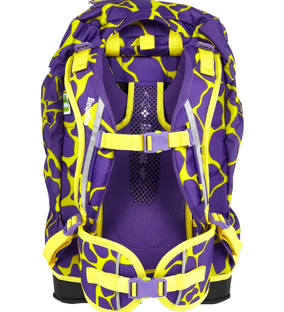 Flot Ergobag skoletaske i neongul med et lilla girafprint og med et tema med væsener med superkræfter.