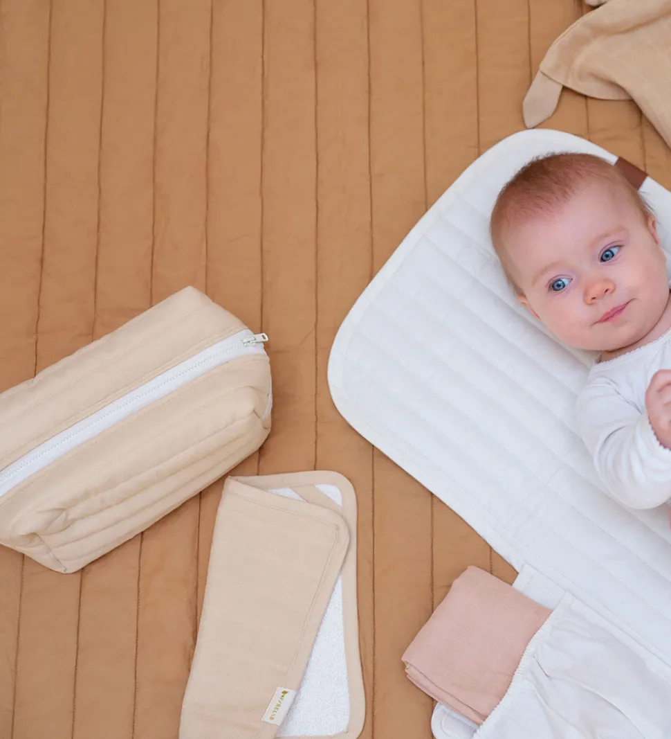 Flot Fabelab toilettaske i en brun nuance med hvide detaljer. Toilettasken er i et dyne-design med lodrette syninger og en let vattering.
