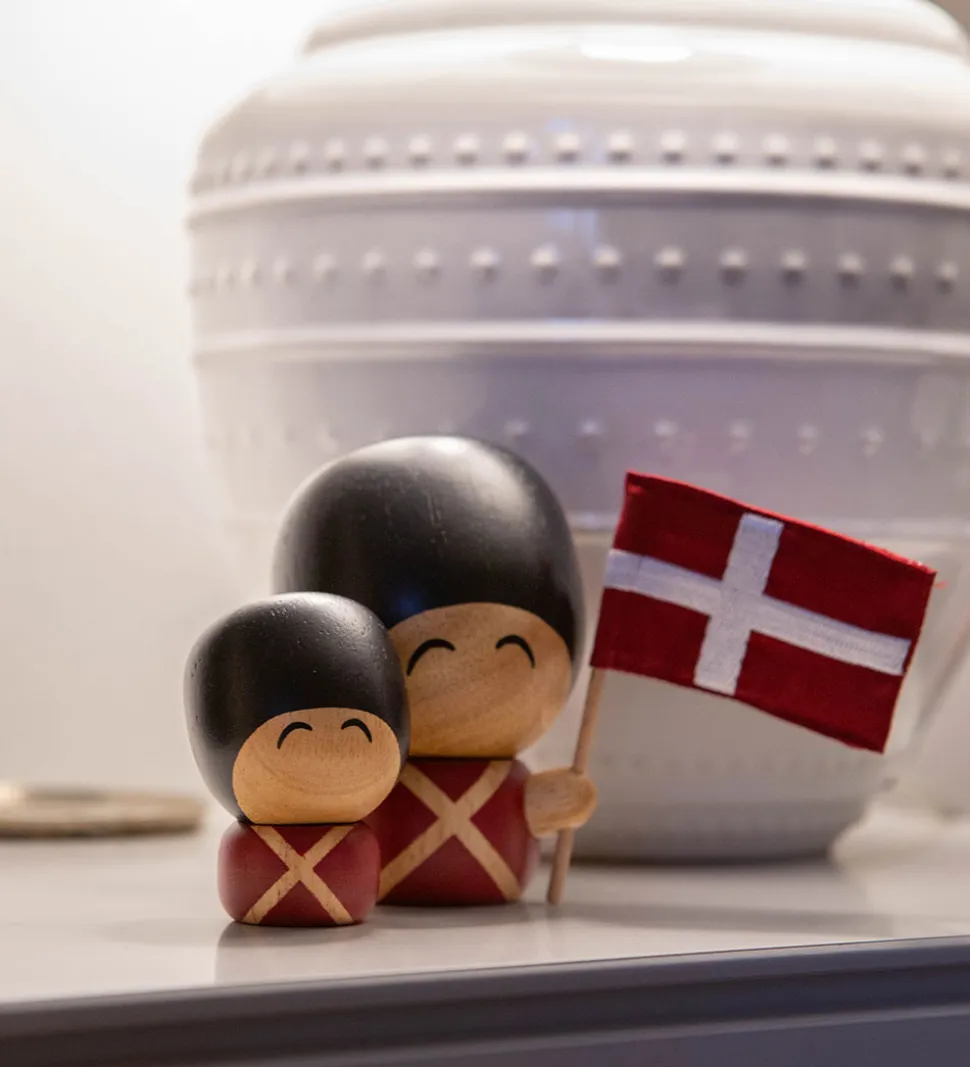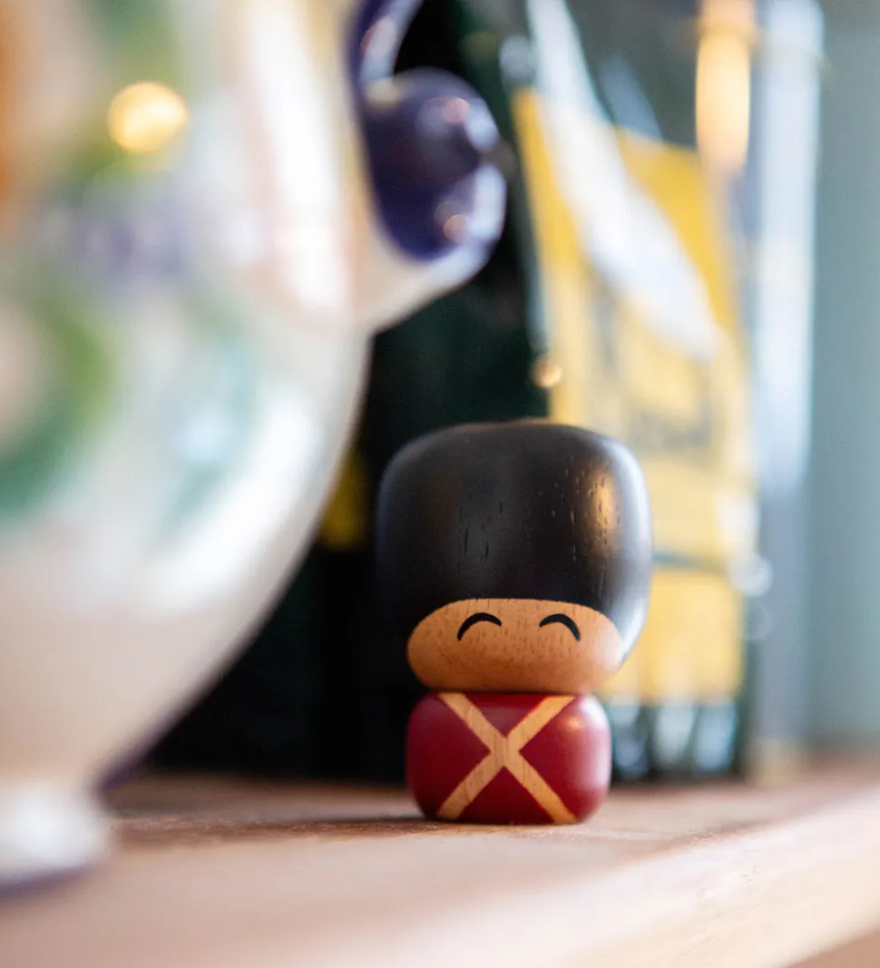 Charmerende FableWood dekoration i træ i naturfarvet, sort og rød. Figuren er formet som den lille garder, Christian.