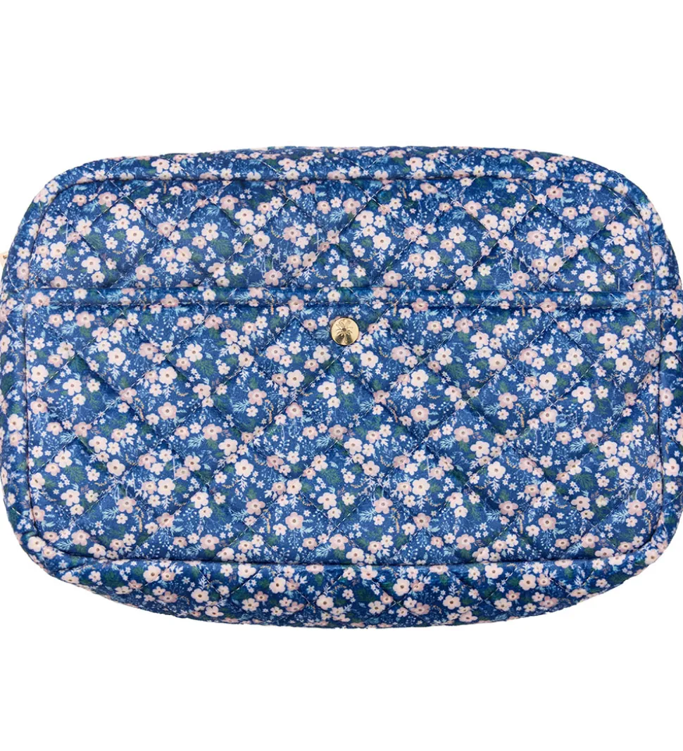 Fin Fan Palm toilettaske i blå med et allover blomsterprint i en flot quiltet struktur.