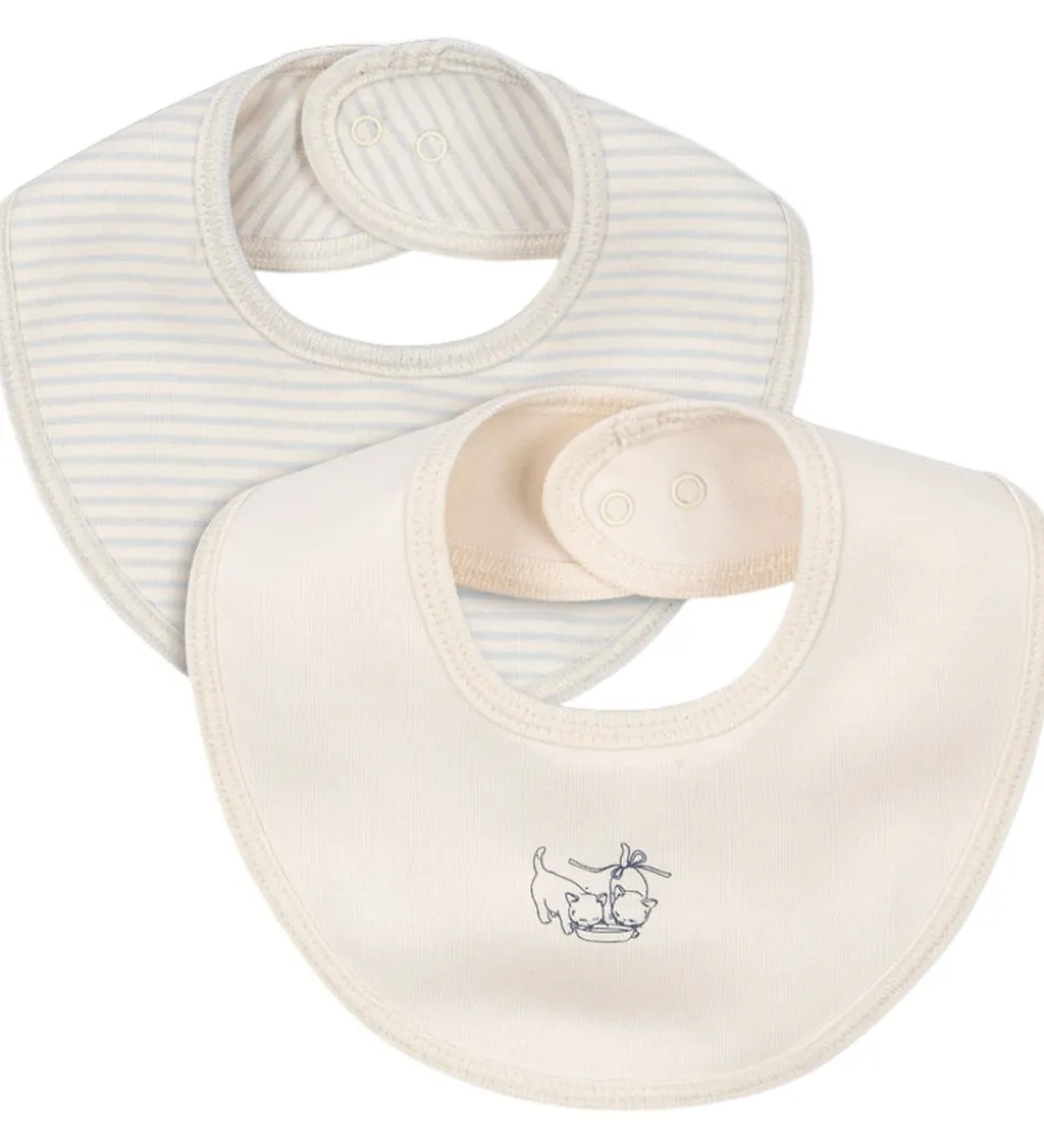Funktionelle Fanga Fontana savlesmække i en pakke med to. Den ene har et diskret, stribet mønster i lyseblå og hvid, mens den anden er ensfarvet cremehvid med et tryk af to katte.
