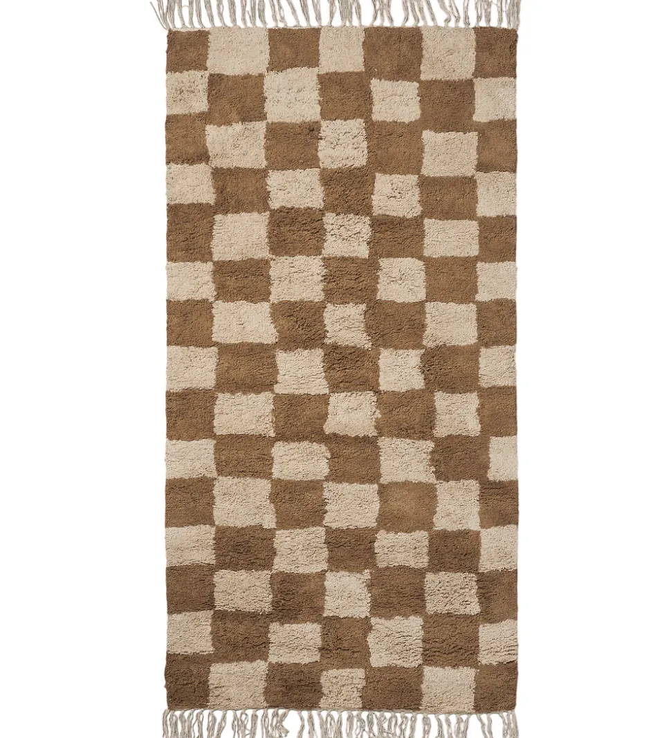 Elegant Ferm Living gulvtæppe med et klassisk, ternet mønster i brune og beige nuancer samt med fine frynser i begge ender. Ferm Living gulvtæppet er et stilfuldt valg til at tilføre varme og struktur til ethvert rum i hjemmet.