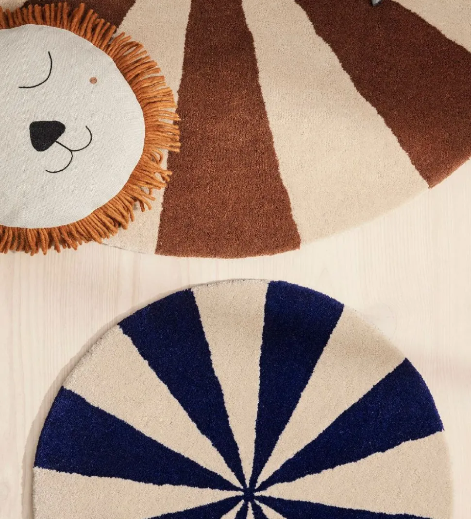 ferm Living gulvtæppet har en rund form og en blød struktur i uld. Gulvtæppet vil passe perfekt ind på børneværelset, men med dets simple design kan det sagtens anvendes i andre rum også.