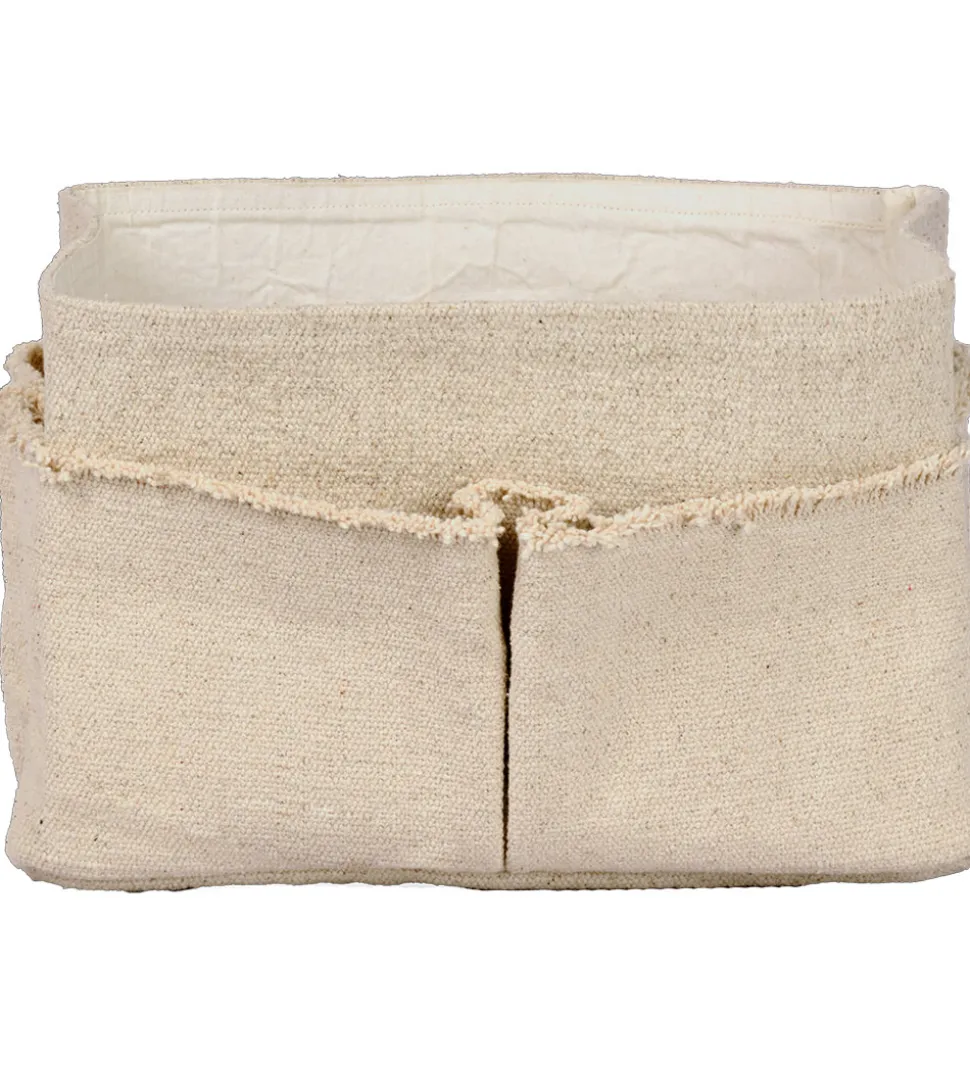 Ferm Living opbevaringskurven er fremstillet af kraftigt bomuld og har et stort rum med otte udvendige lommer, hvilket gør den perfekt til organisering af forskellige ting.