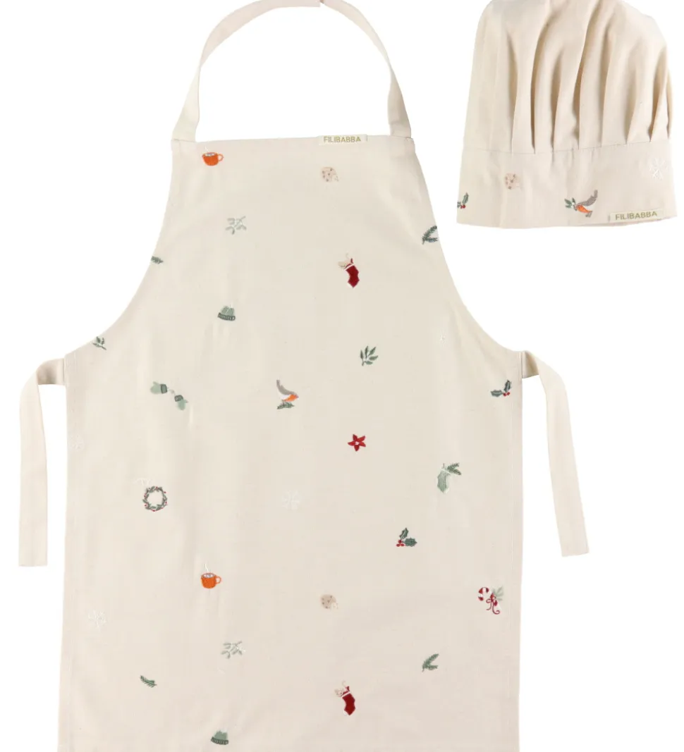 Filibabba forklædet og kokkehuen er perfekt til den lille hjælper i julebageriet. Forklædet har velcrolukninger, mens kokkehuen er justerbar i sin omkreds (50-55 cm).
