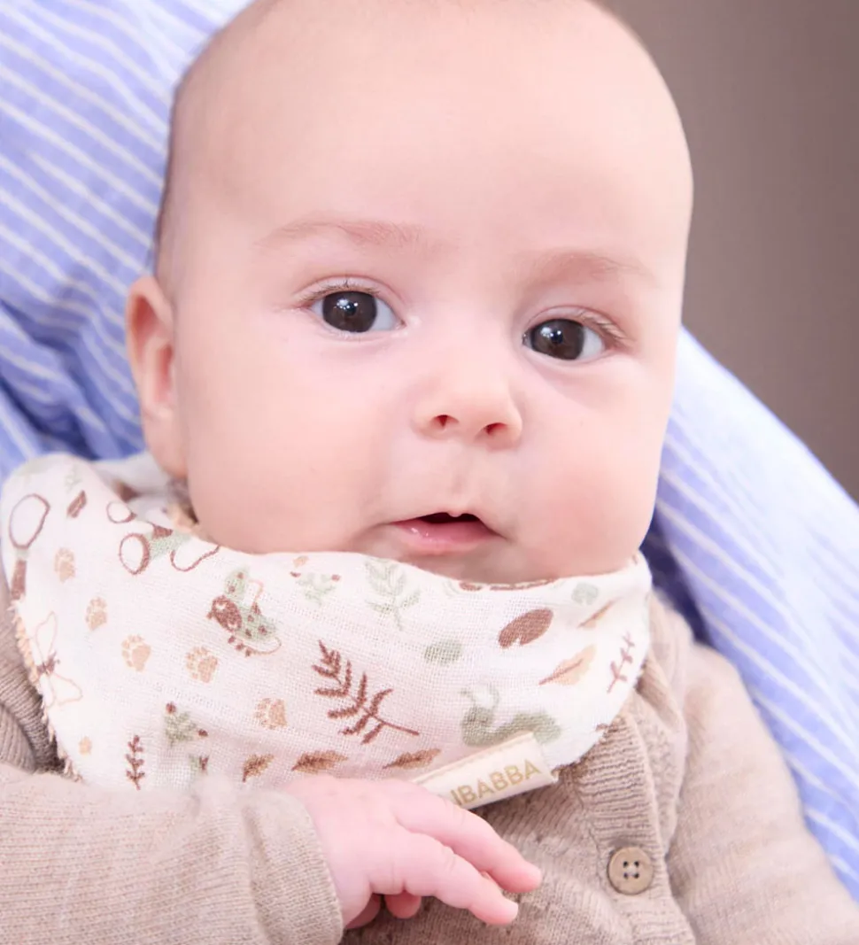 - Hvidt musselin med print af smådyr, planter og blomster, kikkerter og en helt masse andet på den ene side, mens den anden er i beige frotté