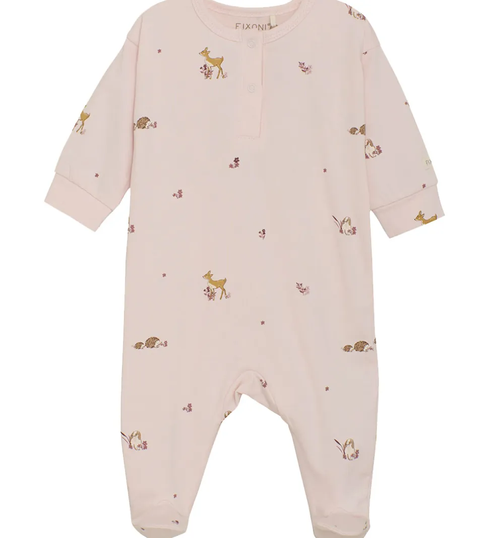 Charmerende Fixoni heldragt i en sart, lyserød nuance med et fint dyreprint bestående af dådyr, kaniner og små blomster.