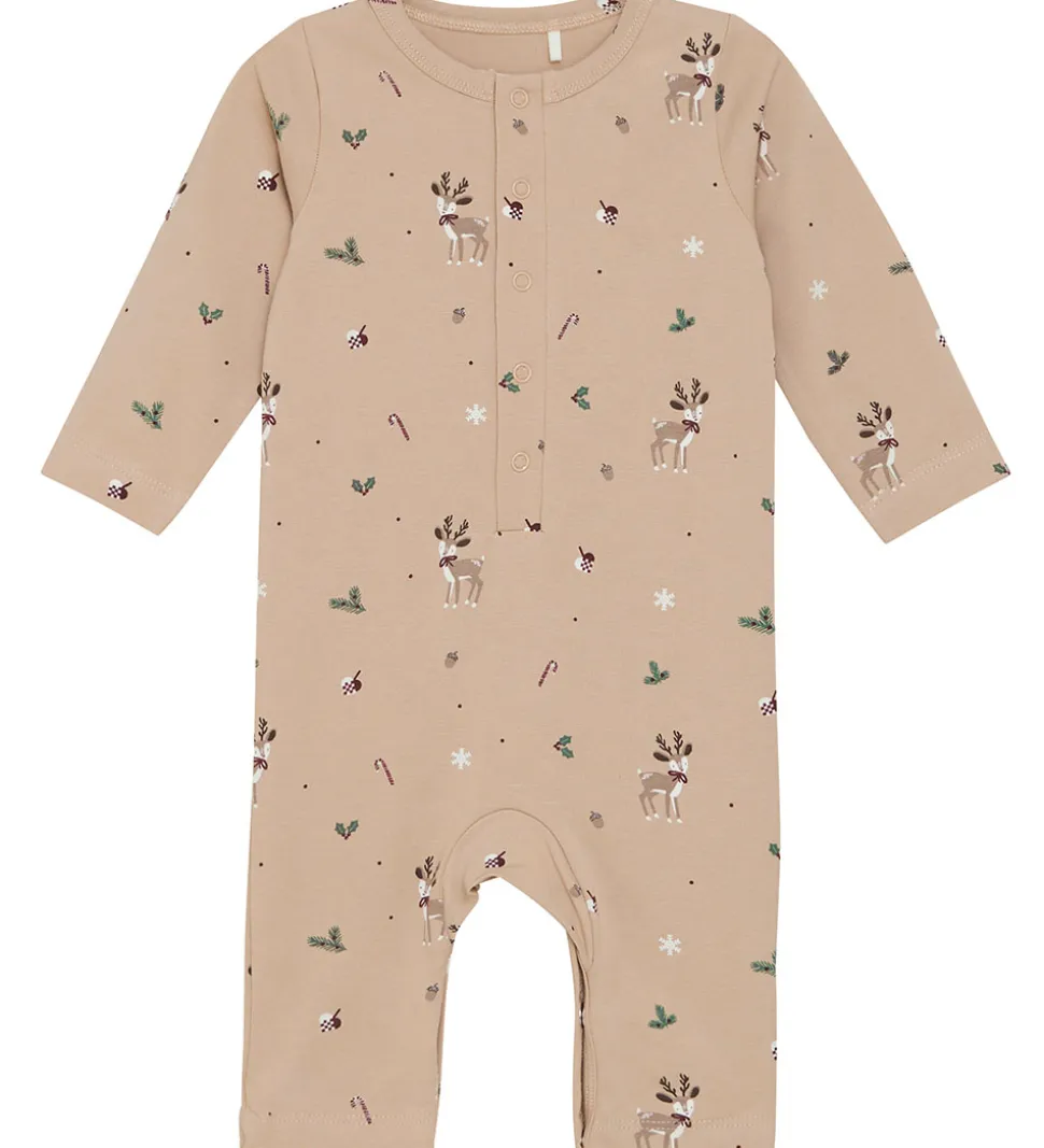Charmerende Fixoni heldragt i en rolig, beige nuance med et yndefuldt print af rensdyr, snefnug og julekæppe.