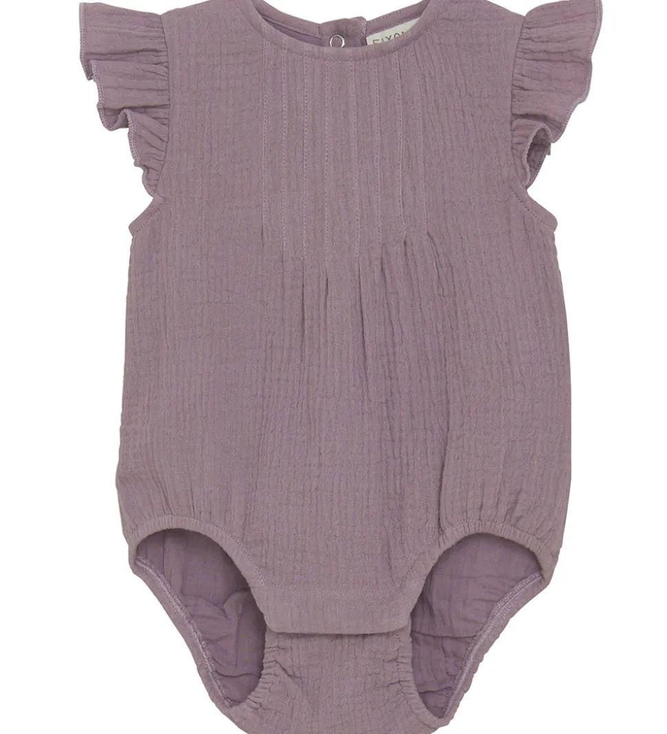 Charmerende Fixoni sommerdragt i en smuk støvet lilla nuance. Sommerdragten har korte flæseærmer og praktiske trykknapper i nakken, som sikrer nem påklædning.