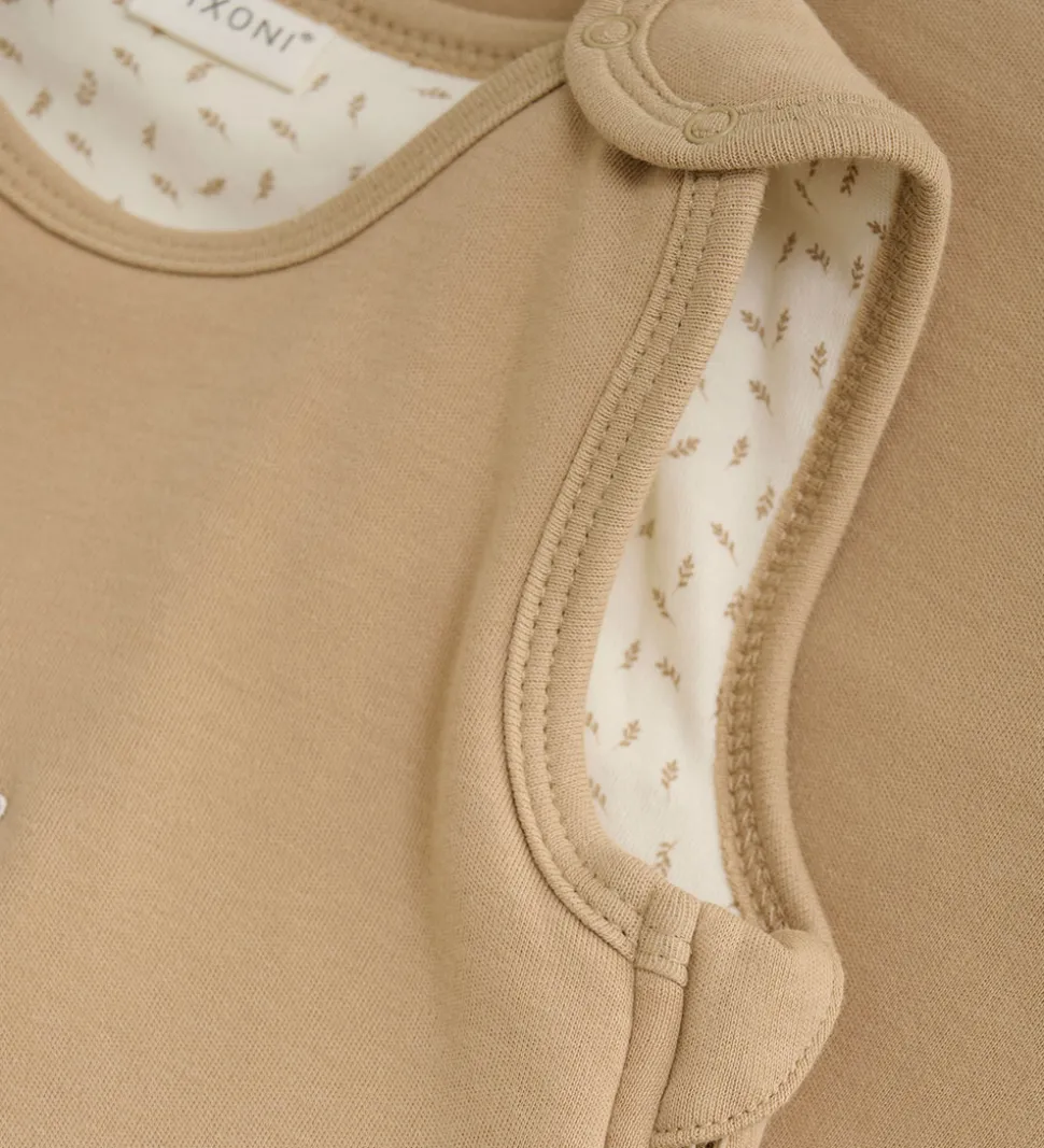 Fixoni soveposen har brede stropper over skuldrene, som hver åbnes med to trykknapper, og soveposen åbnes med en lynlås ned ad venstre side og langs bunden. Lynlåsen har to skydere og en praktisk hagebeskytter. Soveposen er lavet af blødt bomuldsjersey, og den har en let vattering, så barnet holdes varmt.