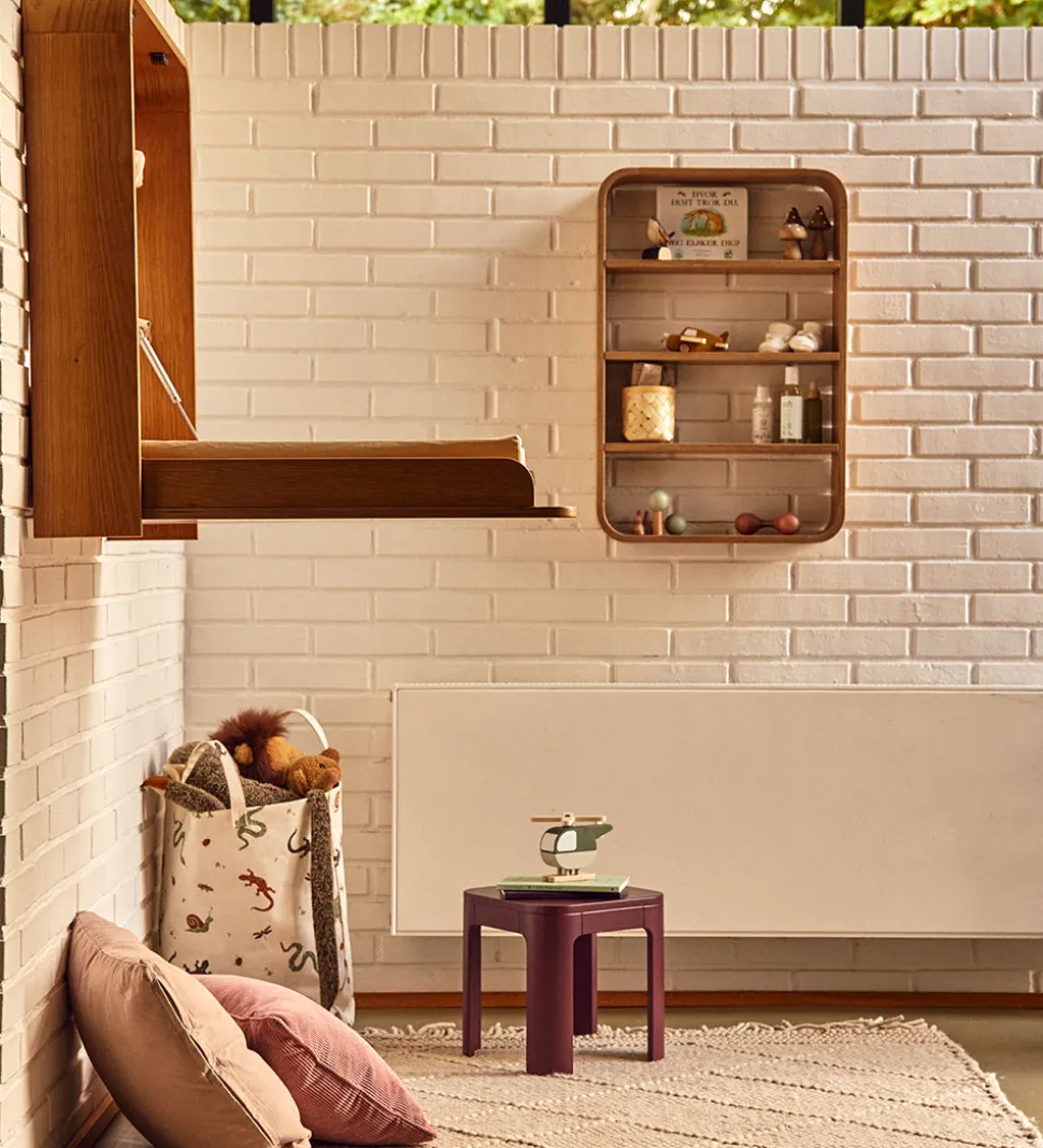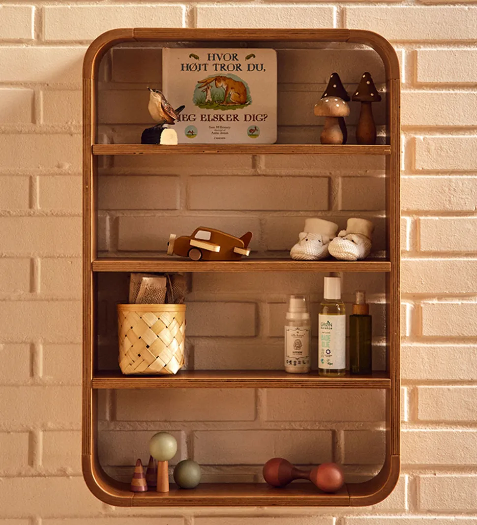 Flexa hylden har rundede hjørner, og der er fem hylder til opbevaring af legetøj, bøger, puslesager, pynteting el. lign. Hylden er væghængt, og den har et enkelt og minimalistisk design.