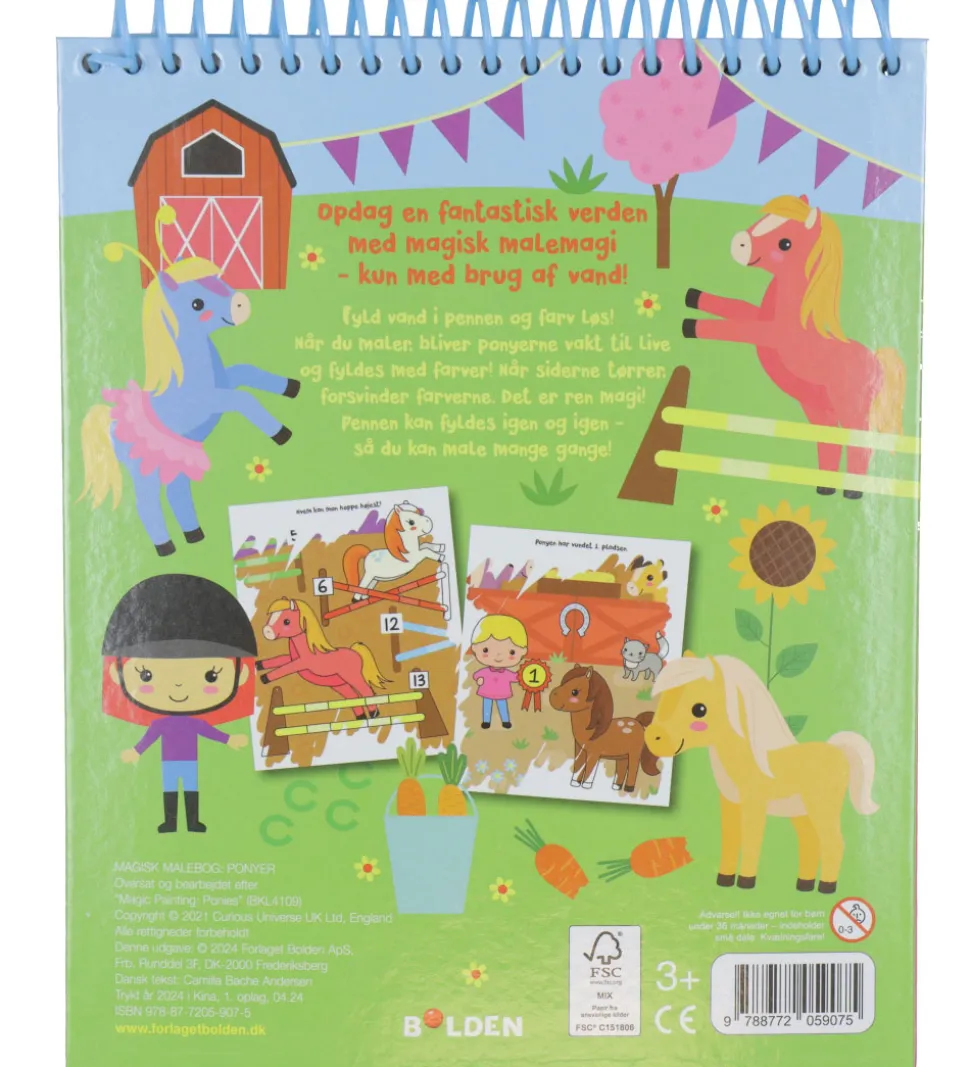 Forlaget bolden malebogen har spiralryg og kraftige sider med motiver, der skal males med den medfølgende, magiske pen, som fyldes med vand. Når vandet fra pennen rammer illustrationerne, toner farverne frem.